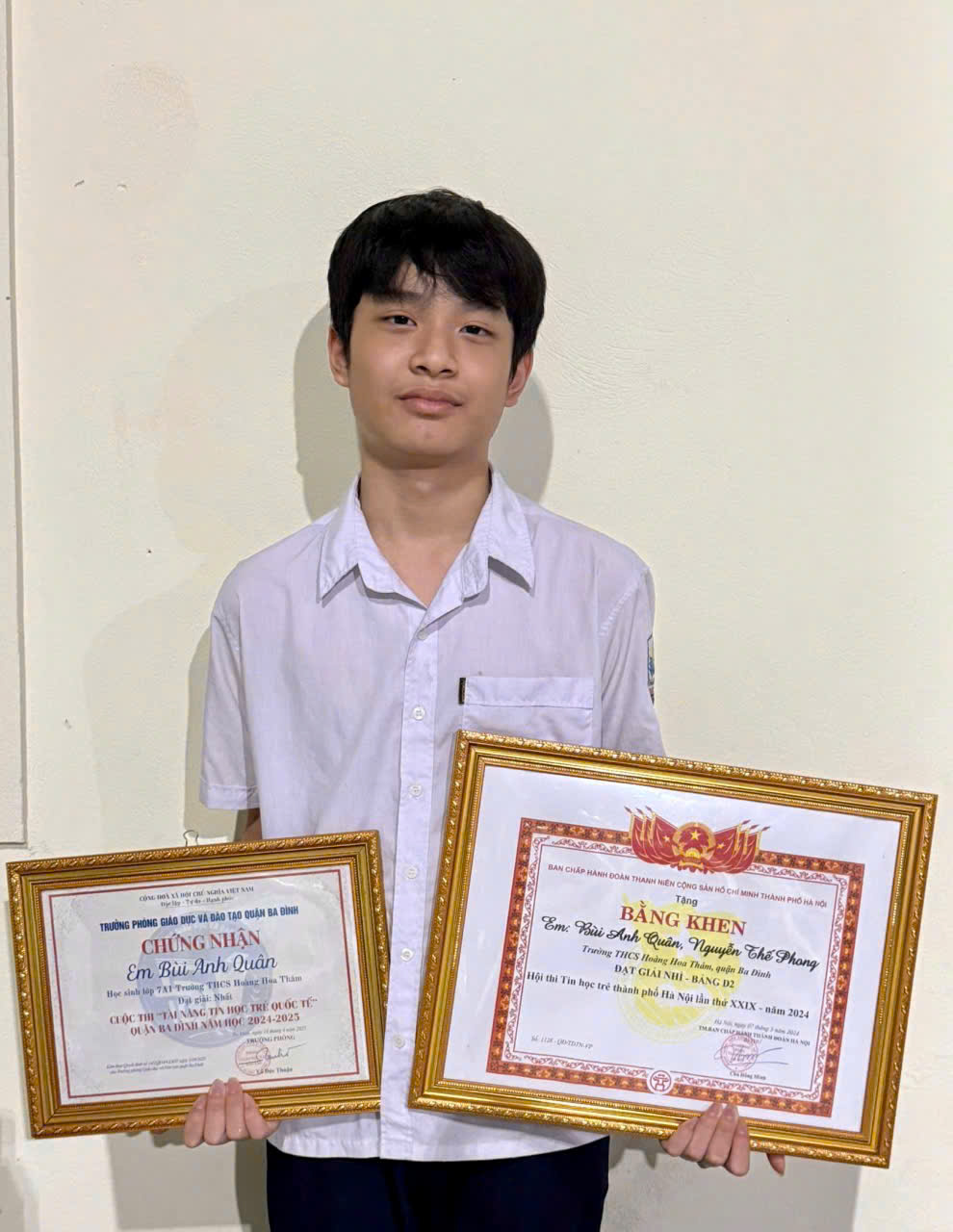 Ở lĩnh vực Tin học – nơi đòi hỏi tư duy logic sắc bén và khả năng xử lý thông tin linh hoạt, Phạm Tuấn Minh và Bùi Anh Quân đã khẳng định bản lĩnh vượt trội khi xuất sắc chinh phục đồng giải Nhất phường Ngọc Hà.