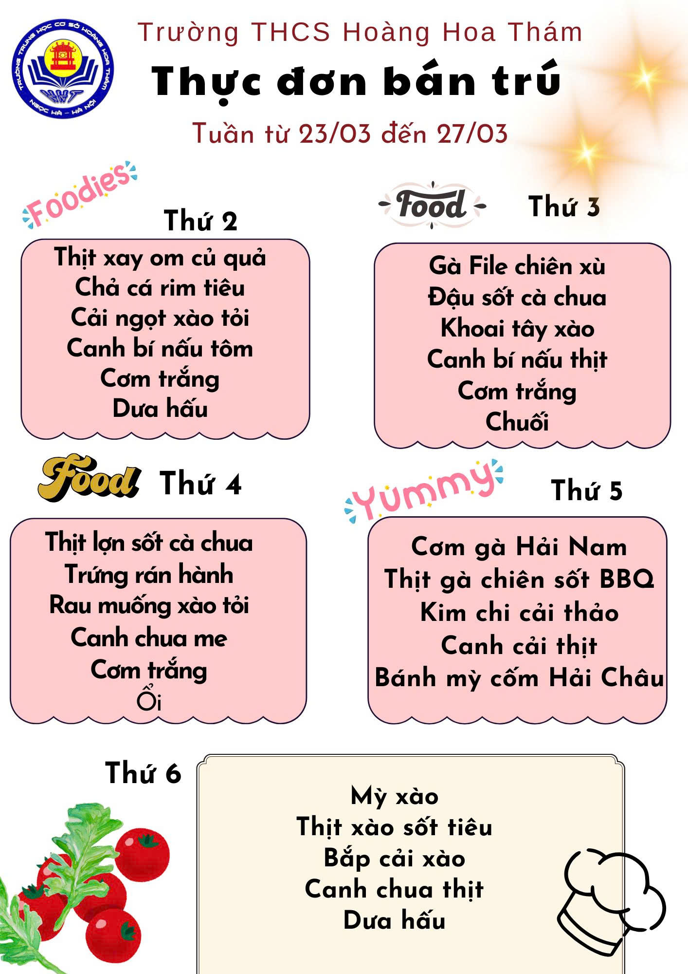 🌷Nhà trường xin gửi tới các bậc phụ huynh và các con học sinh Thực đơn tuần từ 23/03-27/03/2026