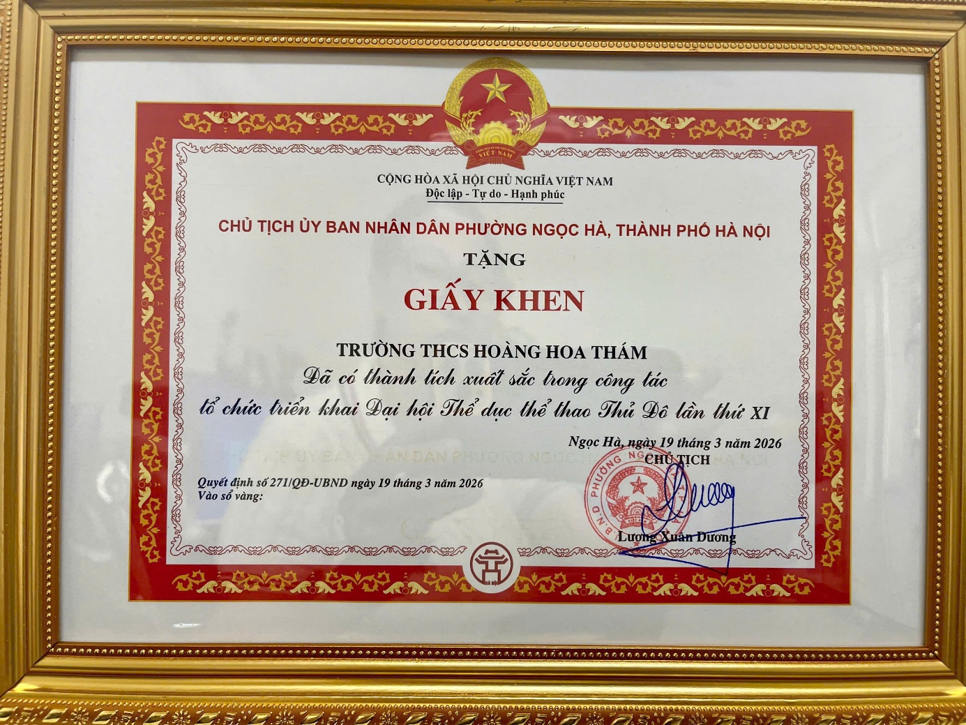 Trường THCS Hoàng Hoa Thám vinh dự được trao tặng Giấy khen vì đã có thành tích xuất sắc trong công tác tổ chức, triển khai Đại hội Thể dục Thể thao Thủ đô lần thứ XI. Đây là sự ghi nhận xứng đáng cho những nỗ lực của tập thể nhà trường trong việc đẩy mạnh phong trào thể dục thể thao học đường, góp phần nâng cao thể chất và tinh thần cho học sinh.