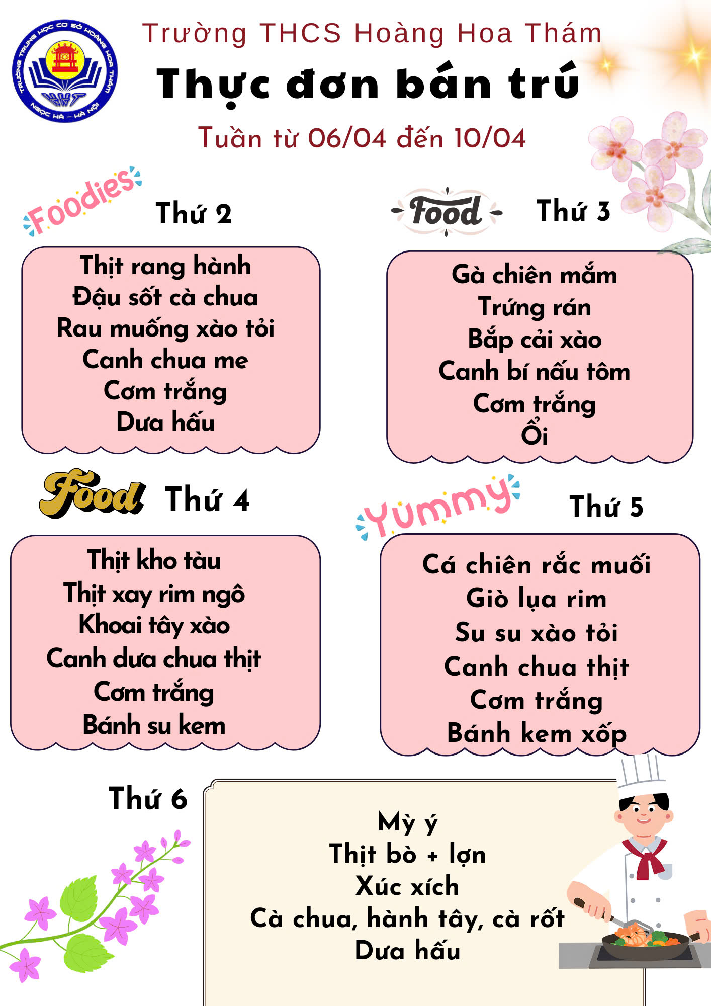 🌷Nhà trường xin gửi tới các bậc phụ huynh và các con học sinh Thực đơn tuần từ 06/04-10/04/2026