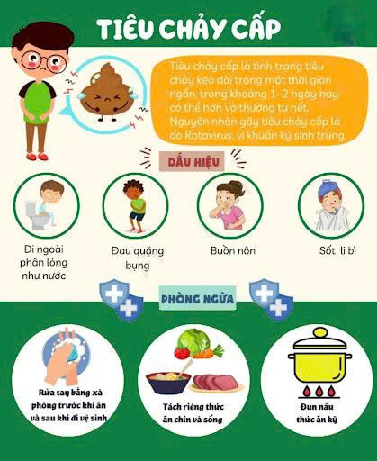 1. Tiêu chảy cấp: là bệnh phổ biến, đặc biệt ở trẻ nhỏ. Bệnh có thể do nhiều nguyên nhân khác nhau gây ra như virus (điển hình là rotavirus), vi khuẩn (tả, lỵ, E.coli) hoặc ký sinh trùng. Người bệnh thường có biểu hiện đau bụng, nôn, đi ngoài phân lỏng nhiều lần, thậm chí có thể dẫn đến mất nước nghiêm trọng nếu không được xử lý kịp thời. Để phòng tránh bệnh tiêu chảy cấp, cần thực hiện nghiêm túc nguyên tắc ăn chín, uống sôi; không sử dụng thực phẩm không rõ nguồn gốc; rửa tay sạch sẽ trước khi ăn và sau khi đi vệ sinh; đảm bảo vệ sinh an toàn thực phẩm trong chế biến và bảo quản.