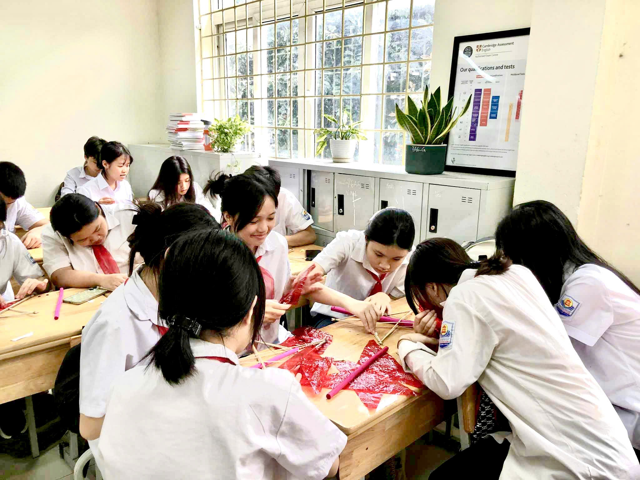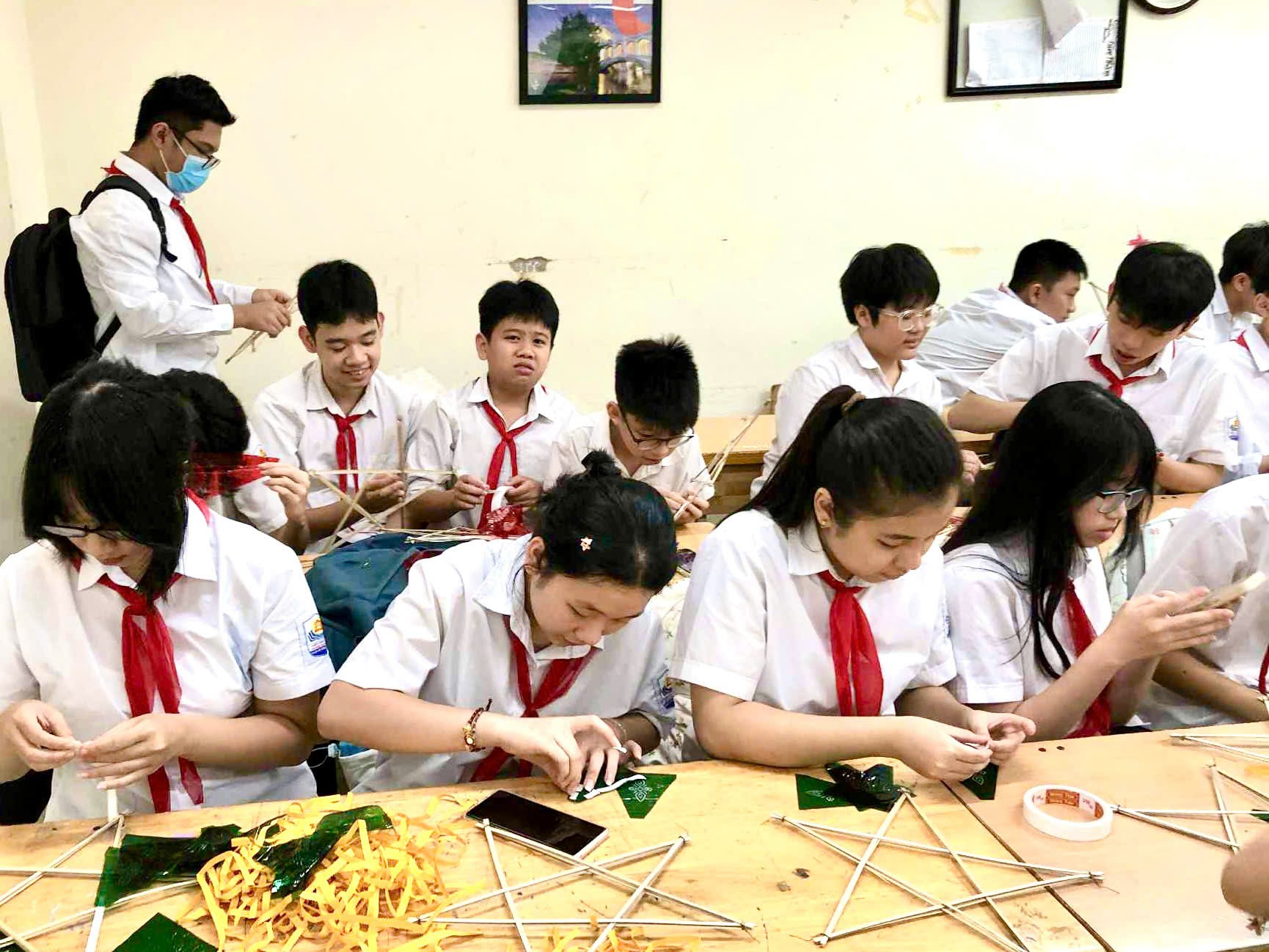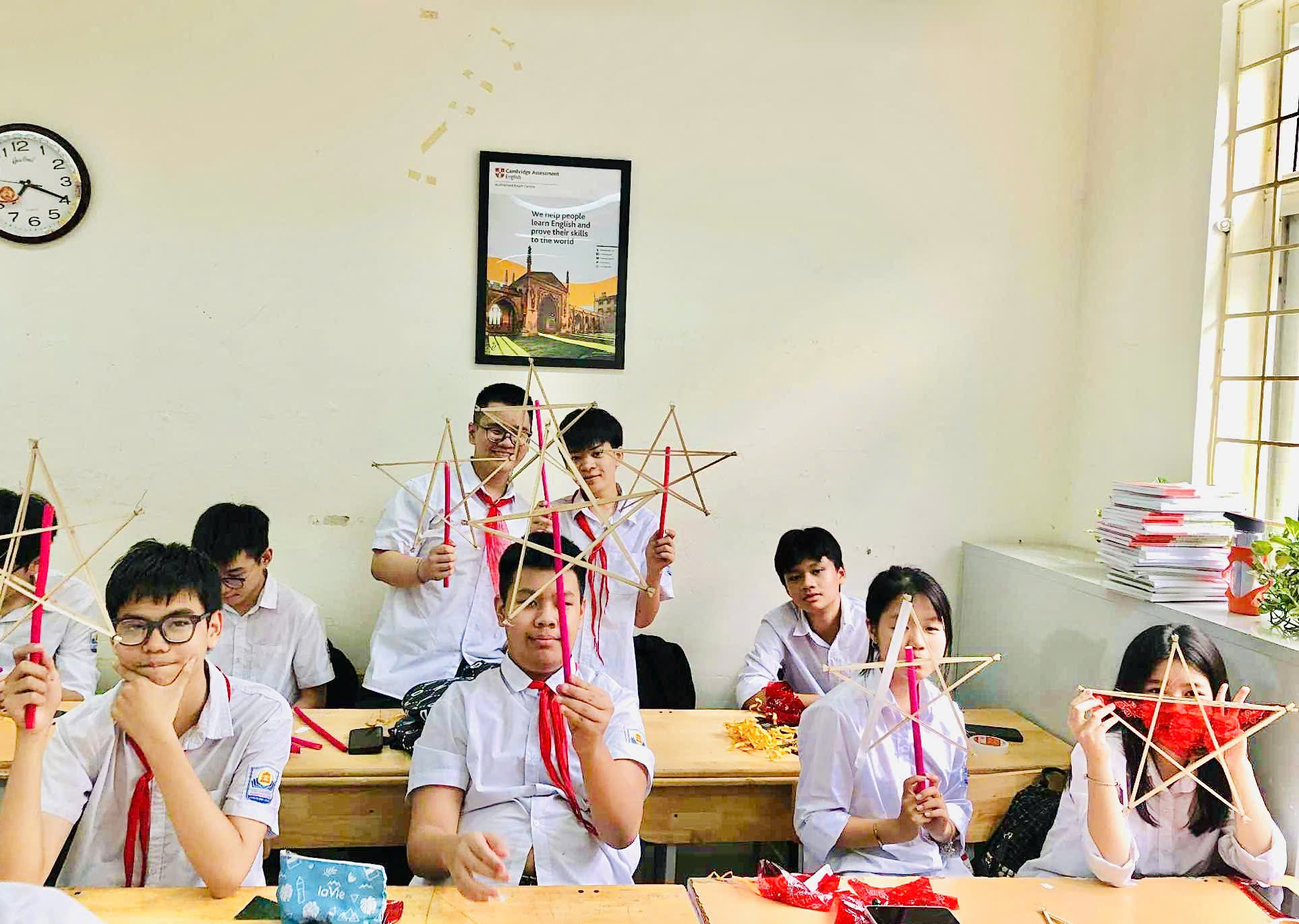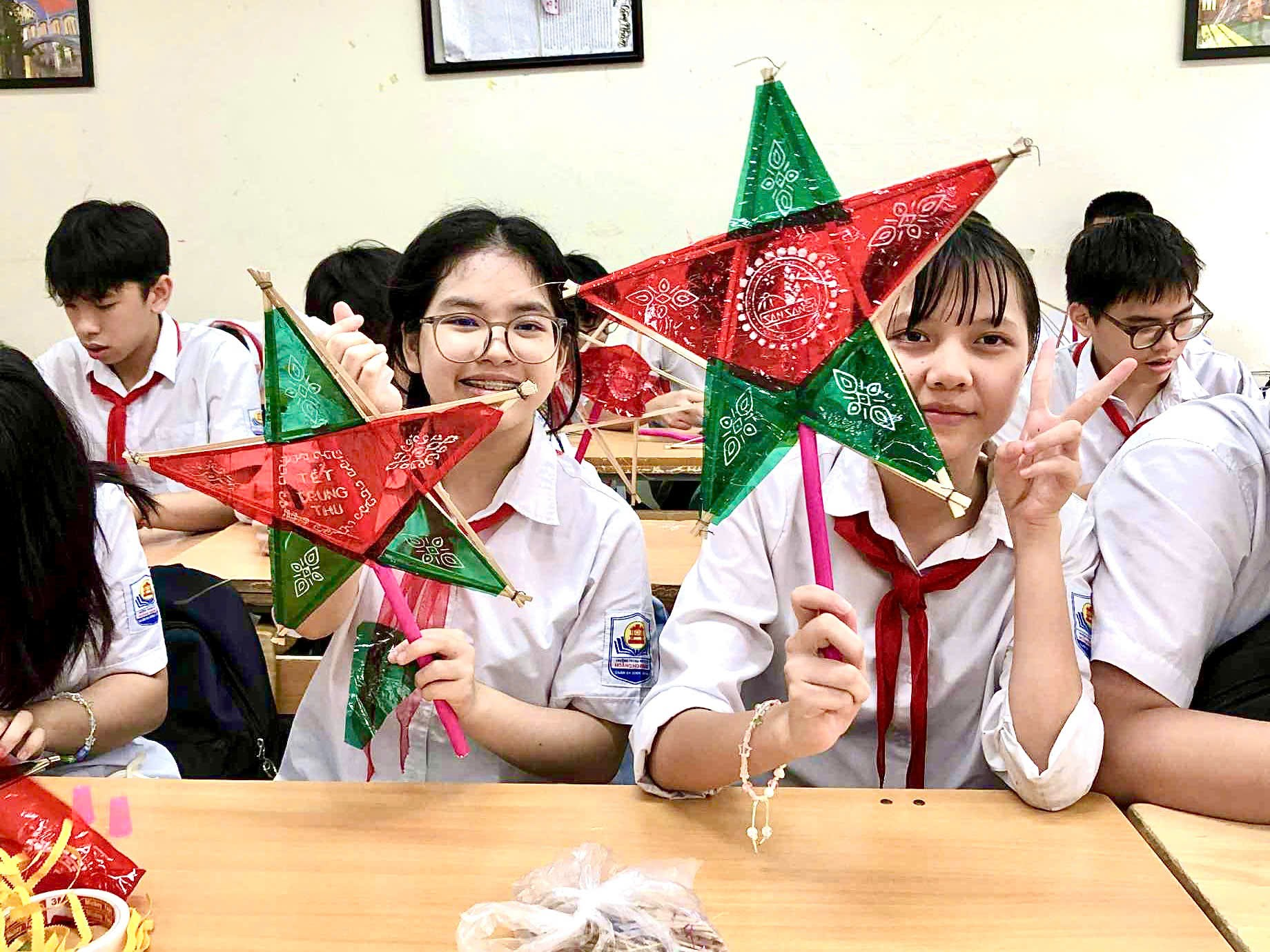 Điểm nhấn nổi bật của hoạt động chính là phần làm đèn ông sao thủ công. Với đôi bàn tay khéo léo và tinh thần sáng tạo, các bạn đã biến tre nứa, giấy bóng kính, kéo và hồ dán thành những chiếc đèn ông sao rực rỡ sắc màu. Mỗi chiếc đèn không chỉ mang nét đẹp truyền thống của Tết Trung thu mà còn chứa đựng tình cảm, sự gắn bó và tinh thần đồng đội của tập thể 9A6.
