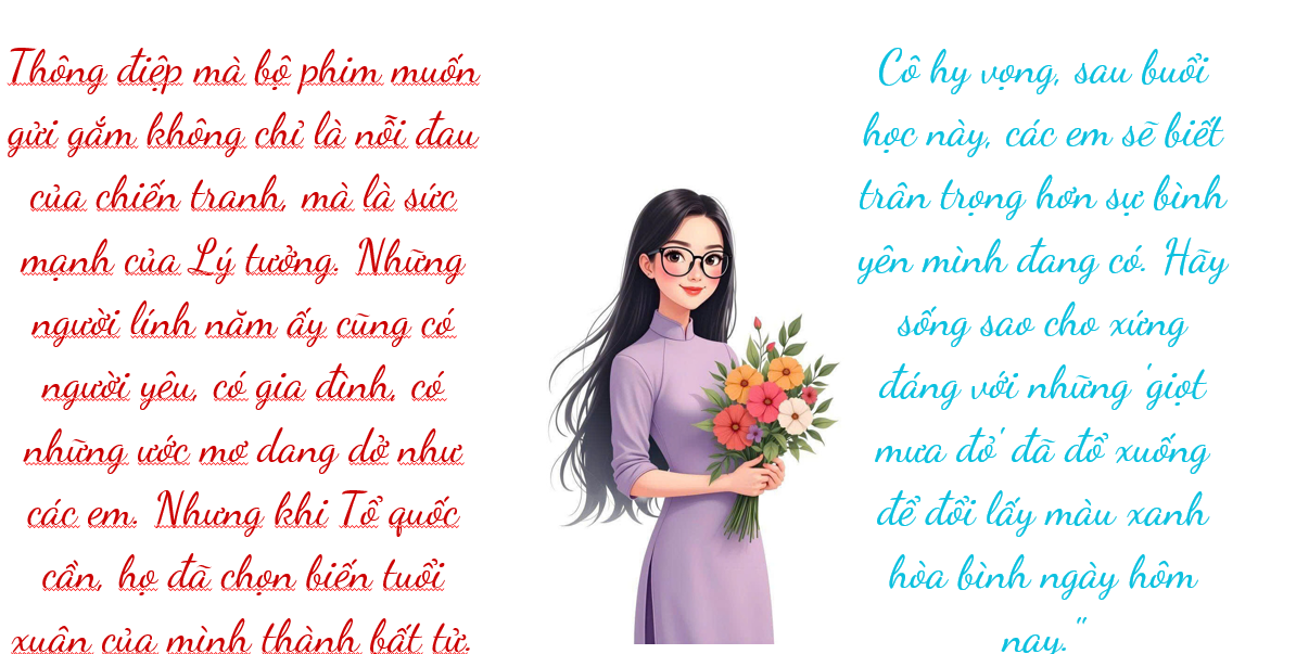 Tiết sinh hoạt tuần 18 không chỉ là một buổi xem phim giải trí, mà là một bài học lịch sử sống động. Qua "Mưa đỏ", chúng mình hiểu rằng cái giá của độc lập là vô cùng quý giá. Là học sinh lớp 6A2, chúng mình tự hứa sẽ học tập thật tốt để xứng đáng với sự hy sinh của các thế hệ đi trước.