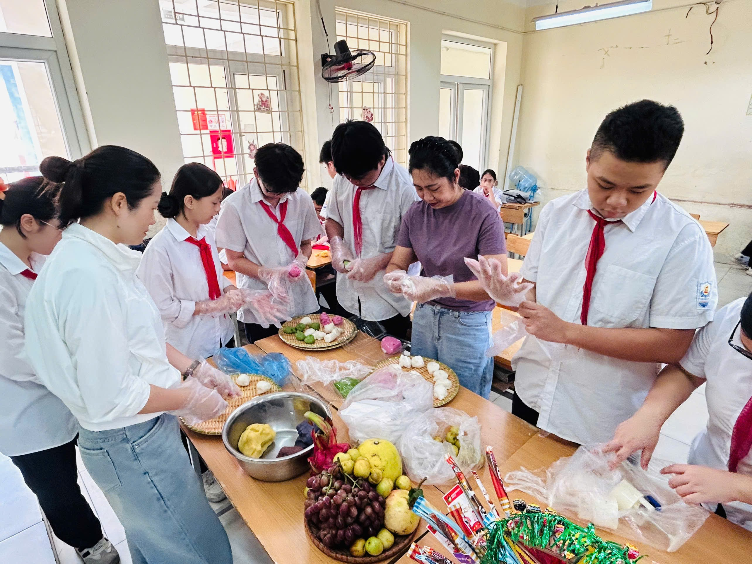 Ban phụ huynh đã chuẩn bị nguyên liệu khá cầu kỳ, mỗi tổ được phân công chuẩn bị từng nguyên liệu khác nhau. Từ việc chọn loại bột nếp thơm lừng, rang xay tỉ mỉ, đến việc sên nhân đậu xanh ngọt bùi, béo ngậy. Ngoài ra mỗi học sinh trong lớp còn chuẩn bị thêm một chút hạt dưa, mứt bí để phần nhân thêm phong phú. Mùi thơm của nước hoa bưởi thoang thoảng tạo nên một không khí thật ấm cúng, đậm chất Trung Thu xưa.