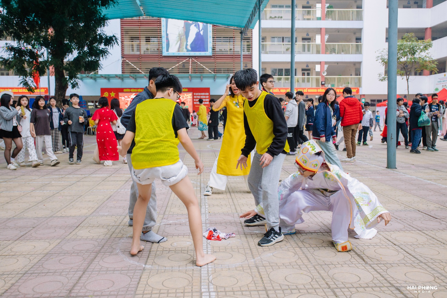 Không khí hội xuân càng thêm sôi động với hàng loạt trò chơi dân gian – những hoạt động gắn liền với tuổi thơ và văn hóa truyền thống Việt Nam. Tiếng cười vang lên từ khu nhảy sạp khi từng tốp học sinh hòa nhịp cùng tiếng nhạc rộn ràng. Khu bịt mắt bắt vịt thu hút đông đảo cổ động viên với những phút giây vui nhộn, hài hước đầy bất ngờ. Ở sân trường, những bước chạy đầy năng lượng từ trò nhảy bao bố hay thi hai người ba chân, bịt mắt đánh trống… lại mang đến tinh thần đoàn kết, phối hợp và nỗ lực hết mình. Mỗi trò chơi đều mang ý nghĩa giáo dục về sự khéo léo, bền bỉ, tinh thần đồng đội – những phẩm chất quan trọng trong hành trình trưởng thành của các em.