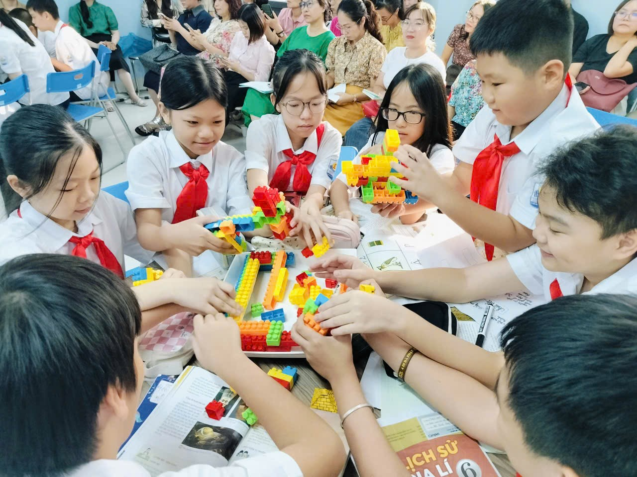 Hoạt động 3 là phần trải nghiệm thú vị nhất khi học sinh tìm hiểu về thành tựu kiến trúc và điêu khắc qua việc lắp ráp mô hình kim tự tháp bằng lego. Dưới bàn tay khéo léo và tinh thần hợp tác, những “kim tự tháp tí hon” dần hình thành, giúp kiến thức lịch sử trở nên sinh động và gần gũi hơn bao giờ hết.