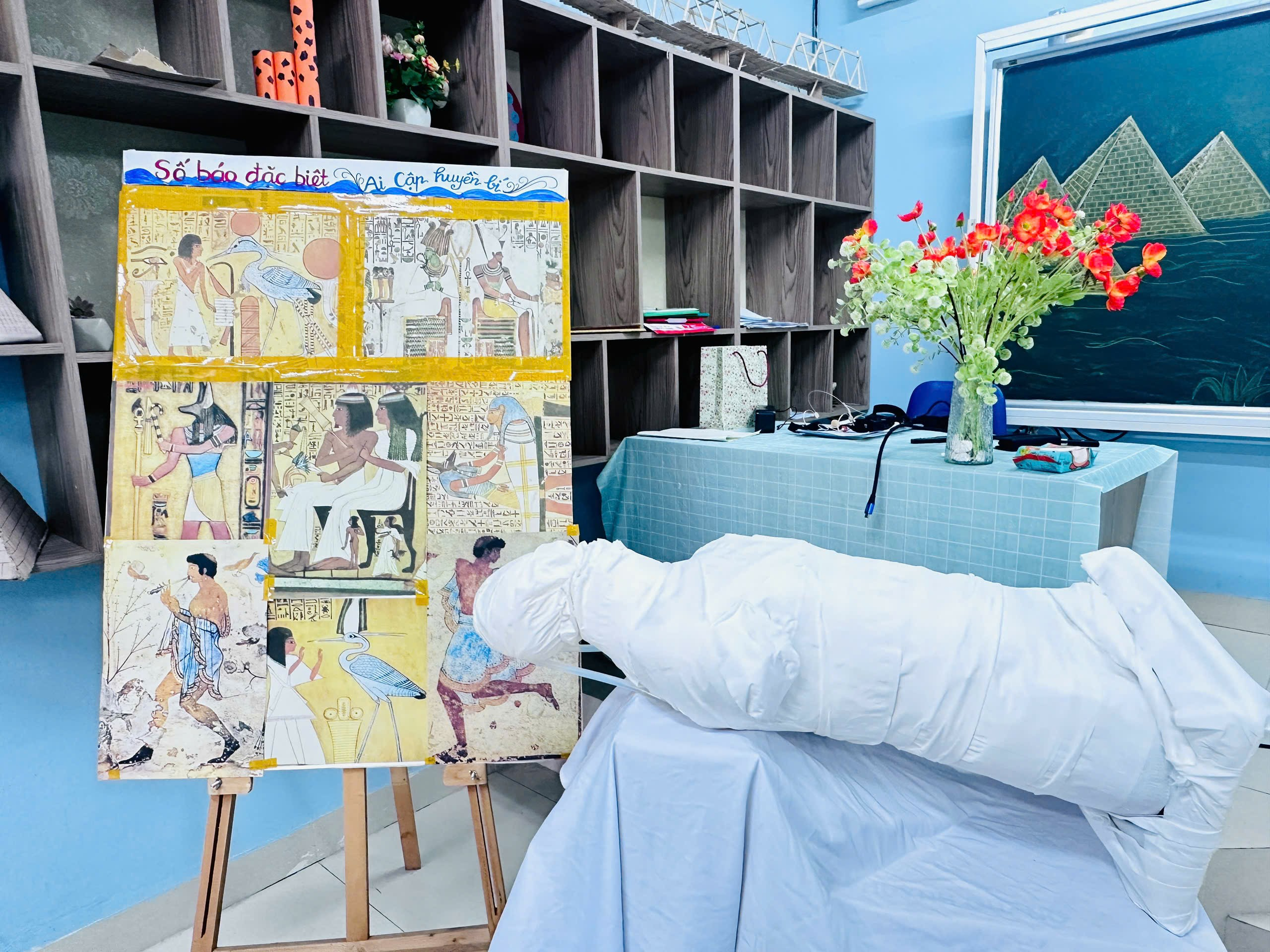 Ở hoạt động 4, học sinh hóa thân thành các “bác sĩ Ai Cập”, cùng tìm hiểu về thành tựu y học qua kỹ thuật ướp xác. Với sự hỗ trợ của công nghệ AI trong việc tra cứu, tìm hiểu và giải đáp thắc mắc, các em đã thể hiện khả năng vận dụng kiến thức và sáng tạo trong vai diễn.