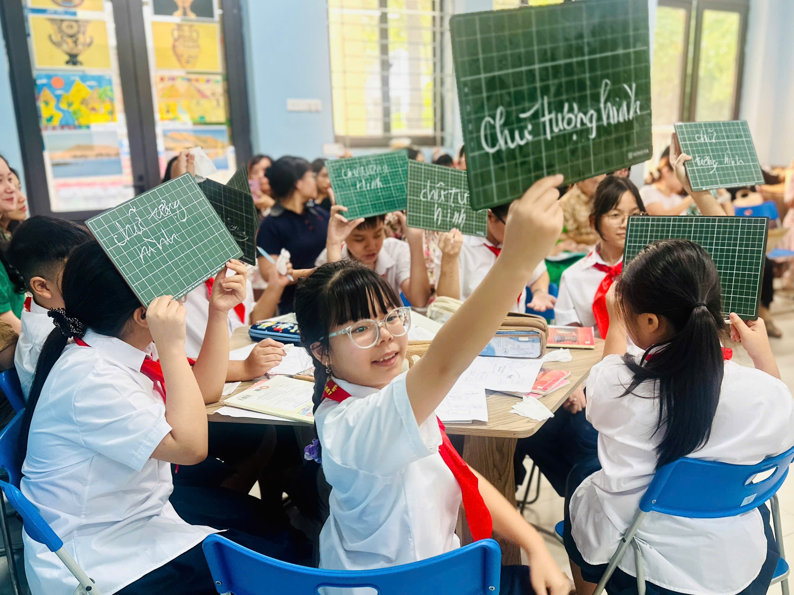 Không khí lớp học trở nên sôi nổi hơn bao giờ hết khi các đội thi đua trả lời nhanh các câu hỏi bằng bảng phấn. Trò chơi vừa giúp học sinh củng cố kiến thức đã học, vừa rèn luyện khả năng phản xạ, hợp tác và ghi nhớ hiệu quả.
