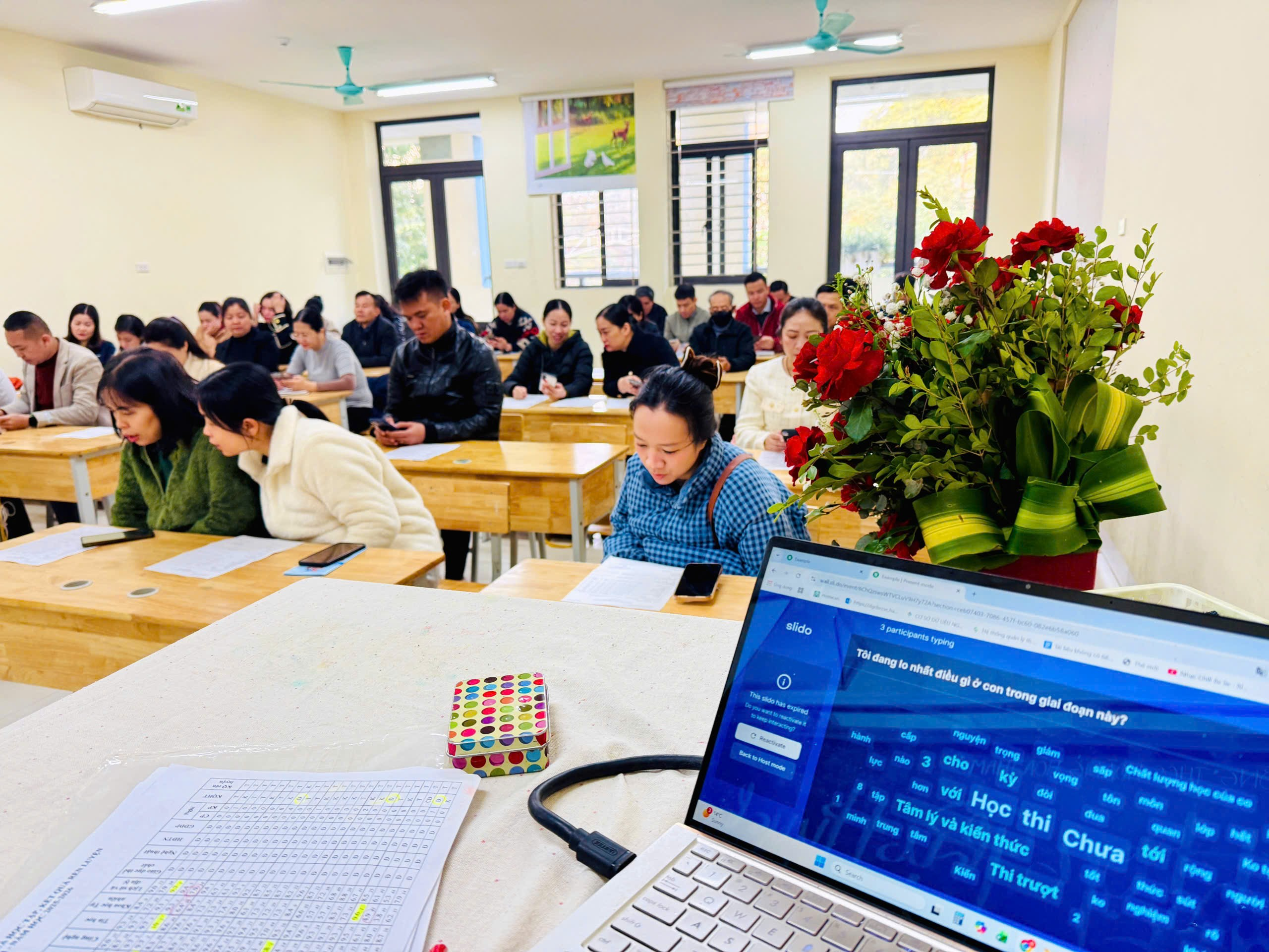Điểm nổi bật của buổi họp là cách tổ chức sáng tạo và bám sát tâm lý phụ huynh lớp cuối cấp của cô giáo chủ nhiệm Nguyễn Thị Thu Hiền. Thay vì chỉ trình bày kết quả học tập, cô đã triển khai các hoạt động tương tác ngay tại lớp: Phụ huynh sử dụng điện thoại quét QR để phản hồi câu hỏi định hướng của giáo viên chủ nhiệm. Các mối băn khoăn hiện lên trực quan thành “đám mây từ khóa”, giúp phụ huynh nhìn thấy bức tranh chung về áp lực học tập, thi cử, tâm lý, thói quen học và mức độ sẵn sàng của học sinh. Từ dữ liệu phản hồi, giáo viên dẫn dắt trao đổi theo nhóm mối lo trọng tâm để chốt giải pháp cụ thể, tránh lan man, “đúng việc – đúng trọng tâm – đúng thời điểm”. Nhờ cách làm này, phụ huynh không chỉ “đến dự” mà thực sự tham gia; thông tin thu được không còn là cảm tính mà trở thành dữ liệu đầu vào cho kế hoạch hỗ trợ học sinh.