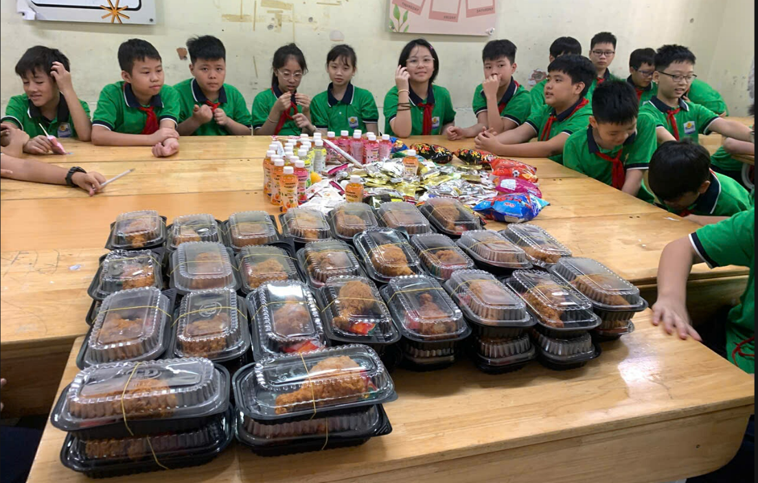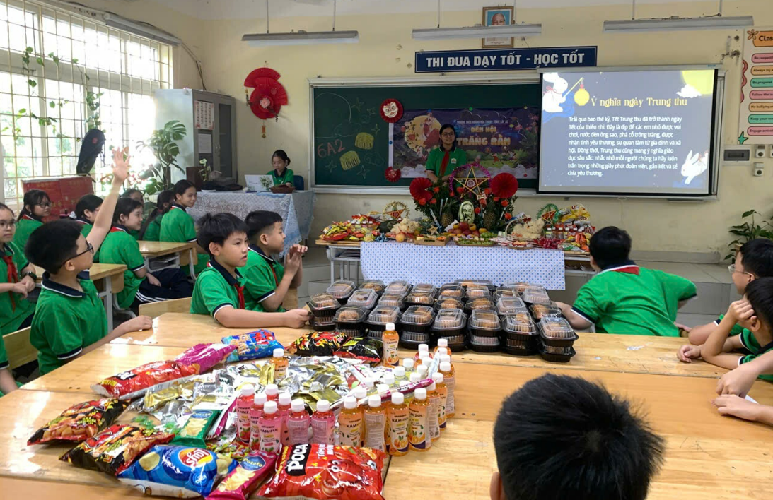 Trên bàn, mâm cỗ được bày biện vô cùng phong phú: nào là bánh nướng, bánh dẻo, bánh kẹo nhiều màu, trái cây tươi ngon, cùng những món quà nhỏ được xếp thành hình ngộ nghĩnh. Tất cả tạo nên một khung cảnh thật đẹp mắt, khiến cả lớp háo hức chờ đợi giây phút phá cỗ.