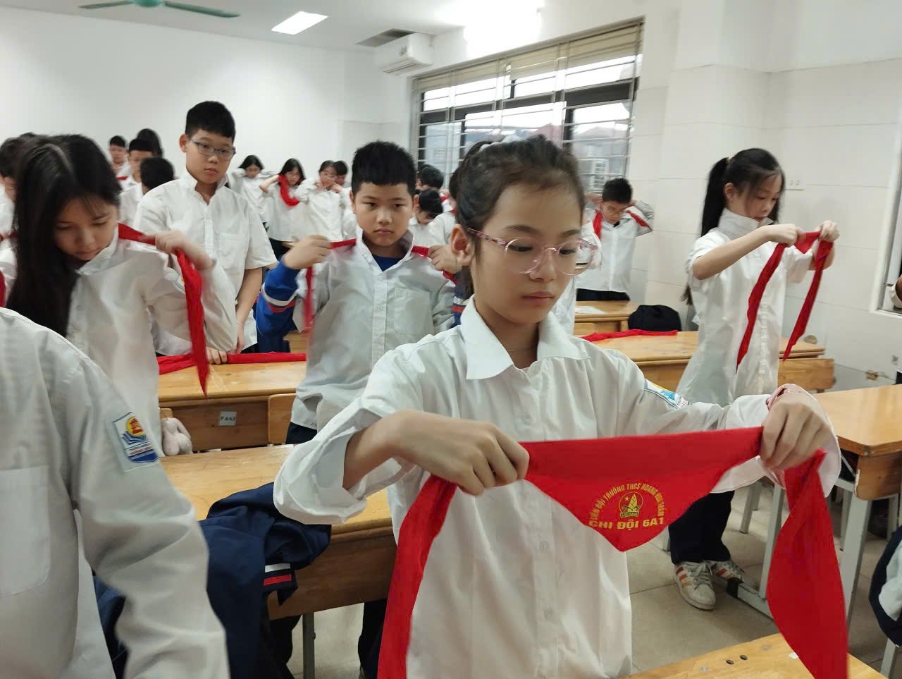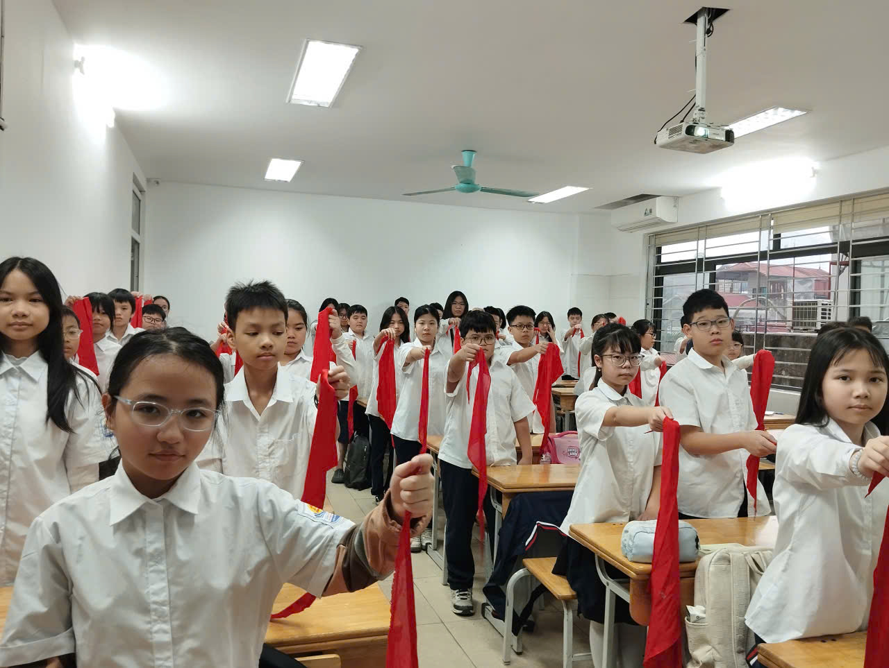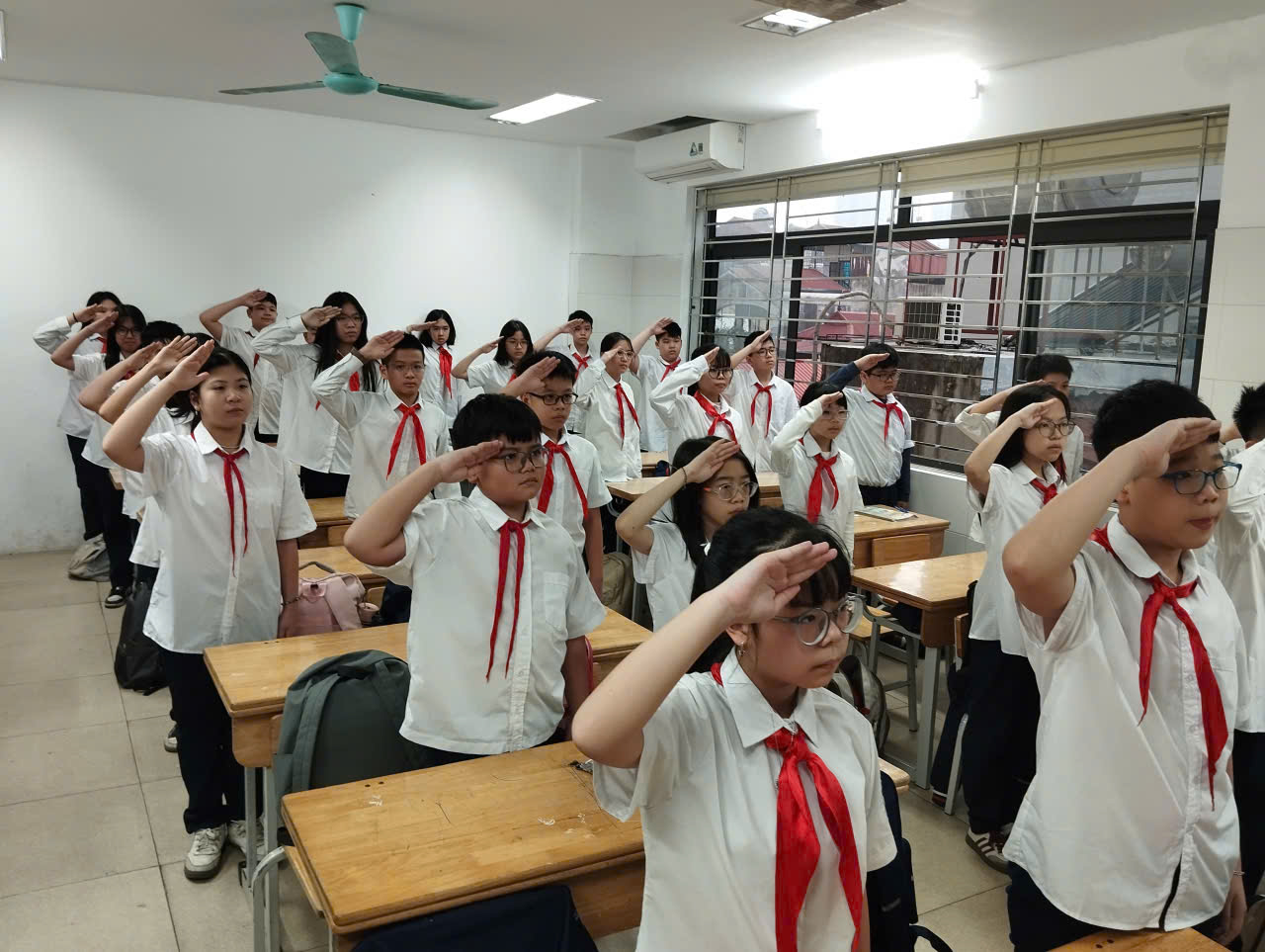 Ở phần chào kiểu đội viên, thầy nhấn mạnh ý nghĩa của động tác chào không chỉ là nghi thức mà còn thể hiện lòng tôn kính, tinh thần kỷ luật và niềm tự hào khi mang trên mình màu khăn quàng đỏ. Phần tháo – thắt khăn quàng được hướng dẫn tỉ mỉ, giúp đội viên thực hành thành thạo, đúng quy cách, tạo sự đồng đều và trang nghiêm trong sinh hoạt Đội.