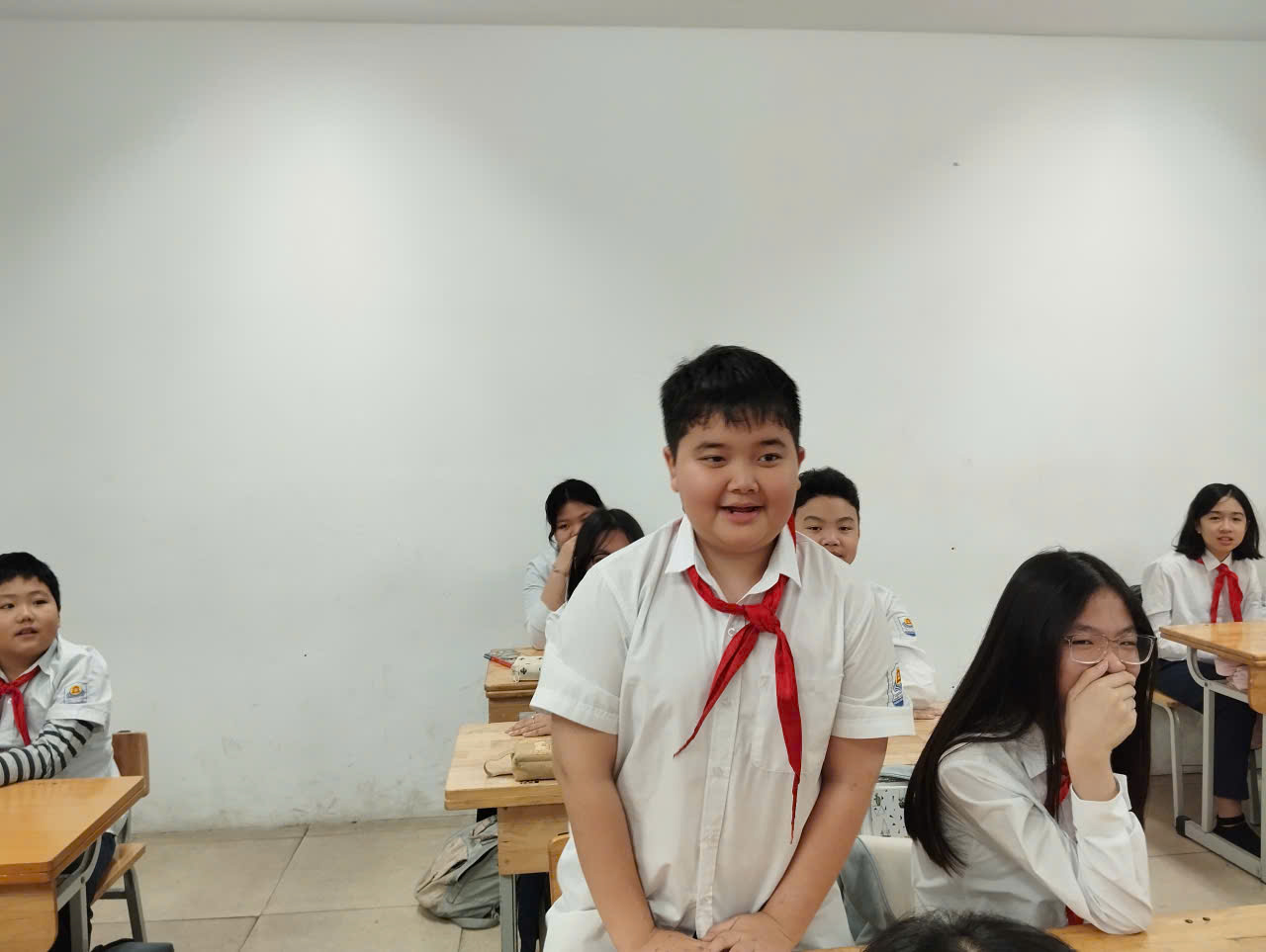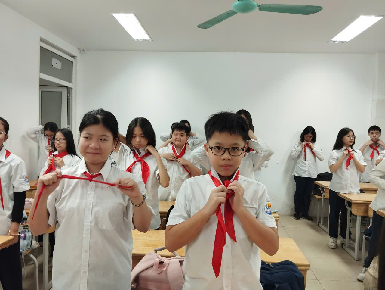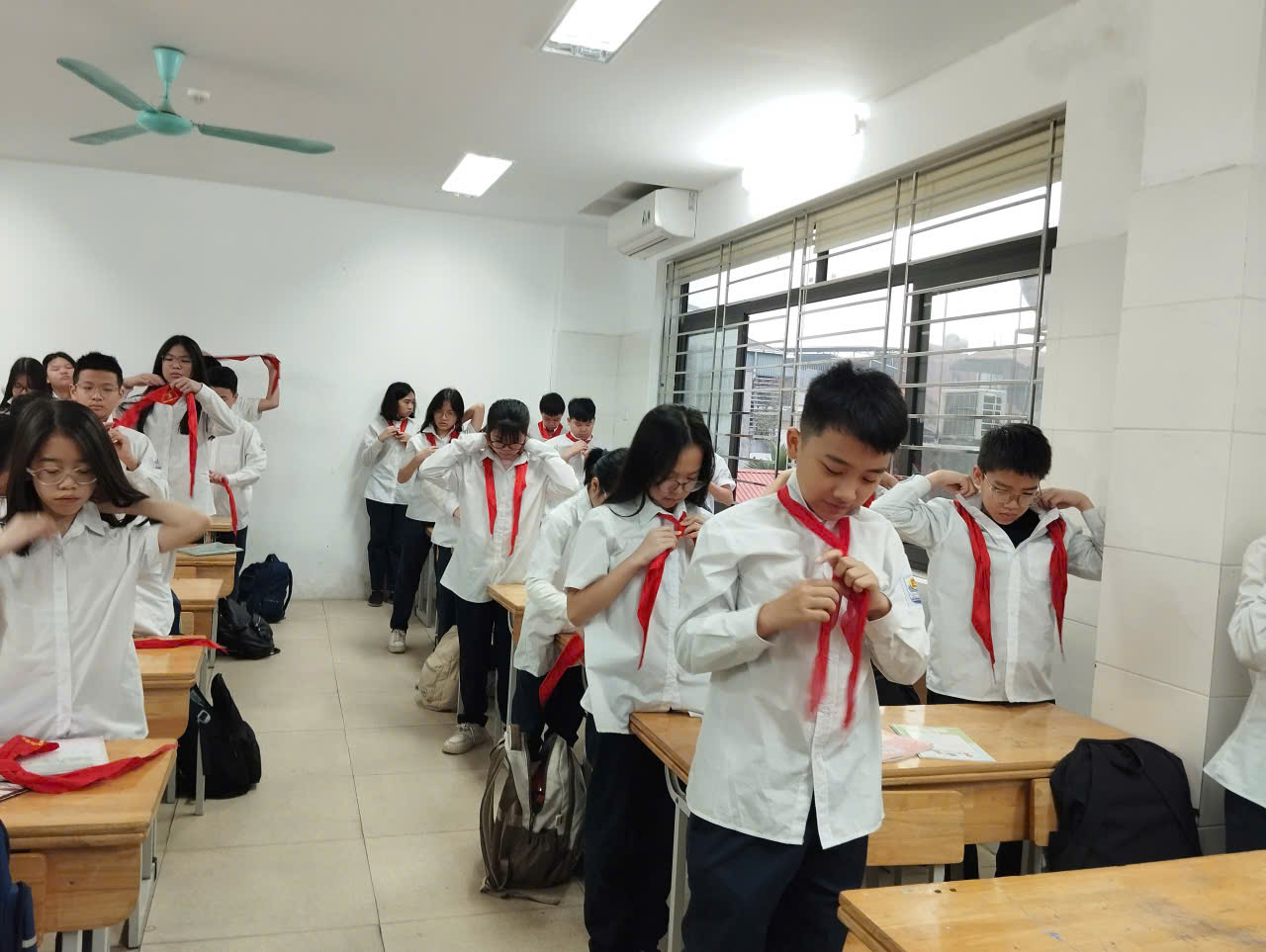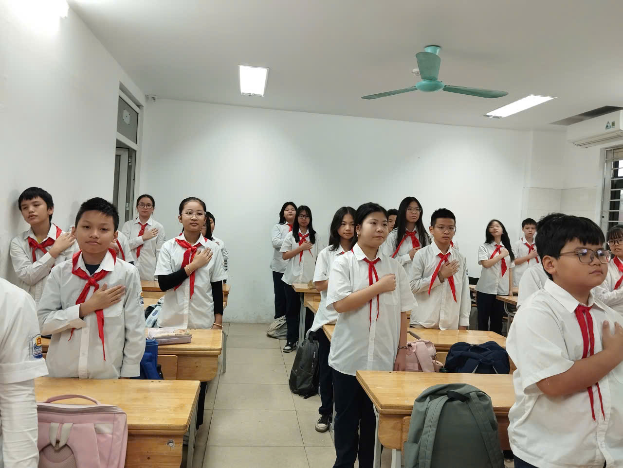 Ở phần chào kiểu đội viên, thầy nhấn mạnh ý nghĩa của động tác chào không chỉ là nghi thức mà còn thể hiện lòng tôn kính, tinh thần kỷ luật và niềm tự hào khi mang trên mình màu khăn quàng đỏ. Phần tháo – thắt khăn quàng được hướng dẫn tỉ mỉ, giúp đội viên thực hành thành thạo, đúng quy cách, tạo sự đồng đều và trang nghiêm trong sinh hoạt Đội.
