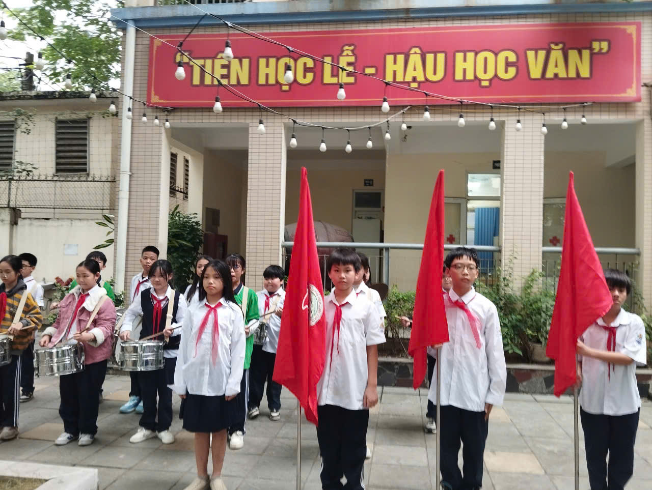 Buổi tập huấn được tổ chức trong không khí sôi nổi, tràn đầy tinh thần đoàn kết và trách nhiệm. Dưới sự hướng dẫn trực tiếp của thầy giáo Bùi Ngọc Đạo - Tổng phụ trách Đội giàu kinh nghiệm cùng các anh chị trong đội nghi thức của Nhà trường. Các đội viên đã được rèn luyện kỹ năng thực hành nghi thức Đội TNTP Hồ Chí Minh — từ động tác cá nhân tại chỗ, đội hình đội ngũ, lễ chào cờ, nghi lễ chào Đội viên, đến thực hành bài trống “Chào cờ – Hành tiến – Chào mừng – Quốc ca”.