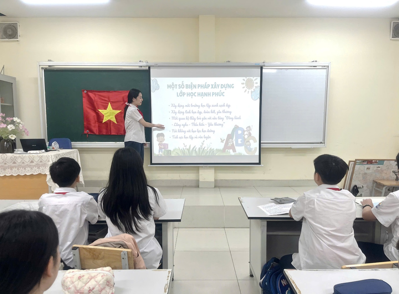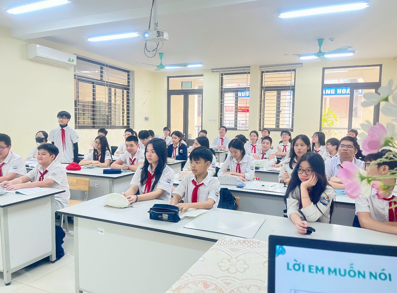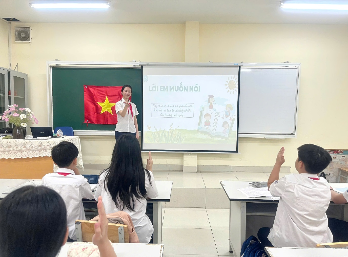 Sau khi xem video, bạn lớp trưởng đã khéo léo đặt ra nhiều câu hỏi gợi mở để cả lớp cùng suy nghĩ và chia sẻ. Không khí lớp học trở nên sôi nổi hơn bao giờ hết khi các bạn học sinh hào hứng giơ tay phát biểu, mạnh dạn bày tỏ quan điểm và mong muốn của mình về một môi trường học tập thân thiện, yêu thương và an toàn.