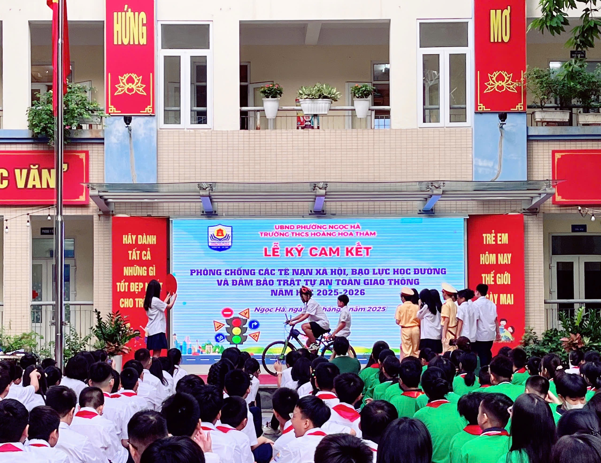 Tiếp sau phần văn nghệ, bạn Lý Trung Dũng – học sinh lớp 8A1 – đã đại diện cho hơn một nghìn học sinh toàn trường trình bày nội dung bản cam kết. Với giọng đọc dõng dạc, rõ ràng, bạn đã thay mặt tập thể học sinh bày tỏ quyết tâm: nghiêm chỉnh chấp hành pháp luật, nói không với bạo lực học đường, tích cực phòng chống tệ nạn xã hội, thực hiện nghiêm túc luật an toàn giao thông và phấn đấu trở thành công dân hữu ích cho xã hội. Thay mặt Ban giám hiệu, cô giáo Nguyễn Thị Lan Hương – Phó Hiệu trưởng nhà trường – đã thông qua nội dung phối hợp giữa nhà trường, công an phường, cha mẹ học sinh và học sinh trong năm học 2025 – 2026. Đây vừa là định hướng, vừa là lời nhắc nhở để mỗi thành viên mái trường Hoàng Hoa Thám nâng cao ý thức trách nhiệm, cùng chung tay xây dựng “trường học an toàn – học sinh thân thiện”.