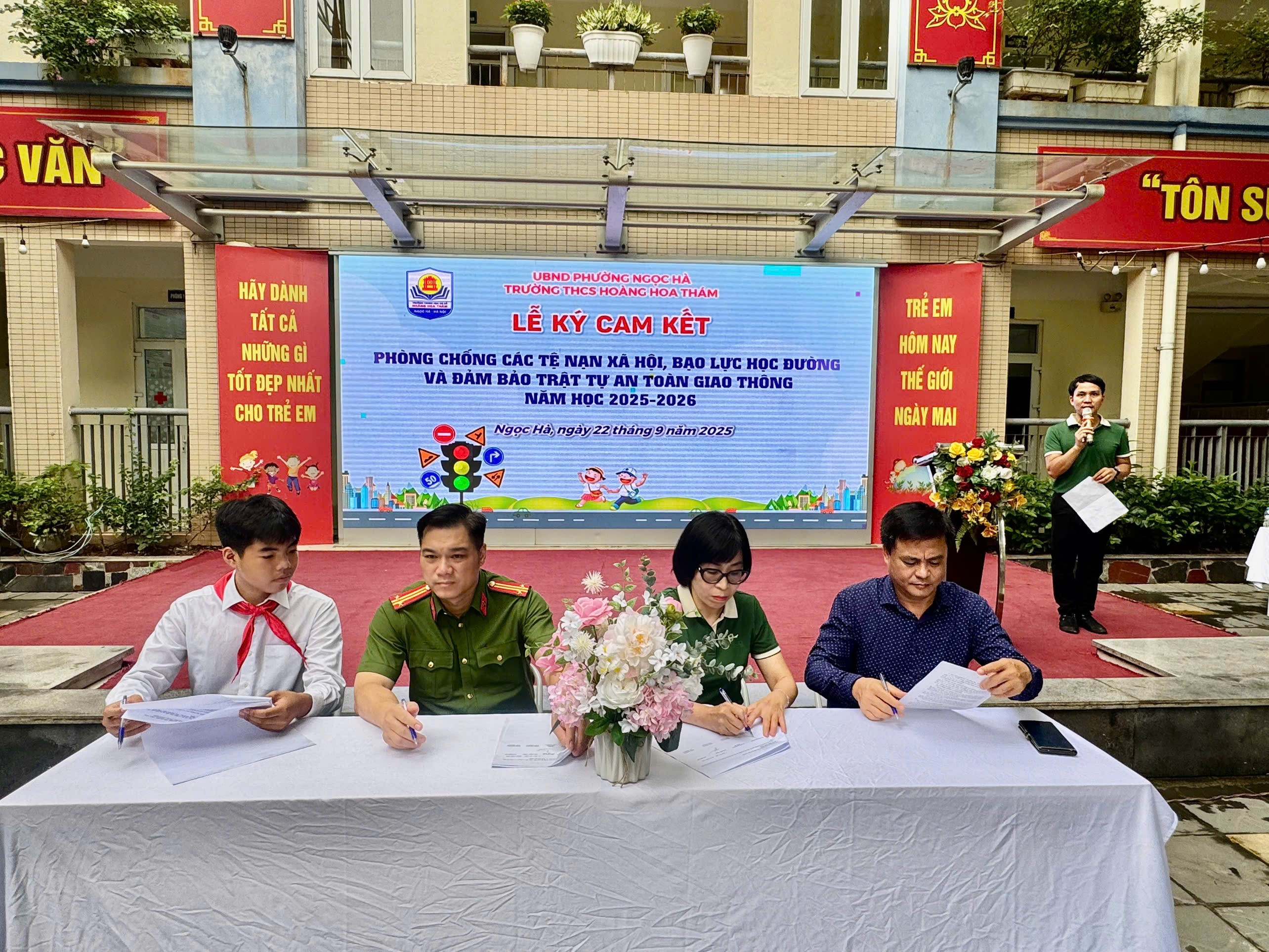 Điểm nhấn nổi bật của chương trình là lễ ký cam kết giữa bốn lực lượng trọng yếu: đại diện Nhà trường, Công an phường, Ban đại diện cha mẹ học sinh và đại diện học sinh. Hoạt động này không chỉ khẳng định tinh thần phối hợp chặt chẽ giữa các bên trong công tác giáo dục mà còn nêu cao trách nhiệm của từng lực lượng đối với việc xây dựng môi trường học đường an toàn, lành mạnh. Cùng với đó, các khối trưởng chủ nhiệm từ khối 6 đến khối 9 cũng tiến hành ký cam kết, thể hiện rõ sự đồng thuận, quyết tâm cao và cam kết thực hiện hiệu quả các nhiệm vụ trọng tâm của năm học mới.