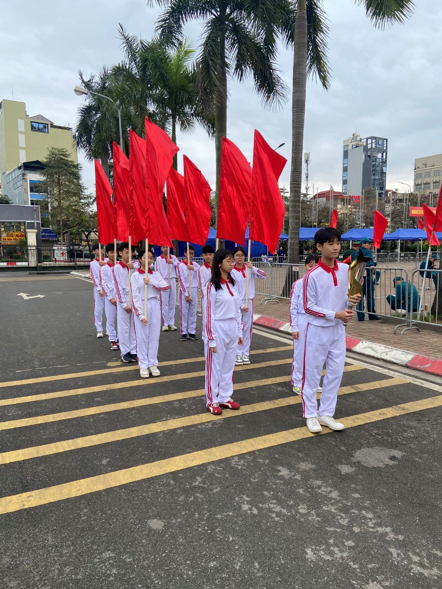 Để có được phần nghi thức trang trọng ấy, các em học sinh đã tích cực tập luyện dưới sự hướng dẫn của thầy cô giáo. Từng động tác, đội hình, nhịp bước đều được chuẩn bị chu đáo, thể hiện tinh thần kỷ luật và sự nghiêm túc của học sinh Trường THCS Hoàng Hoa Thám khi tham gia hoạt động chung của địa phương.