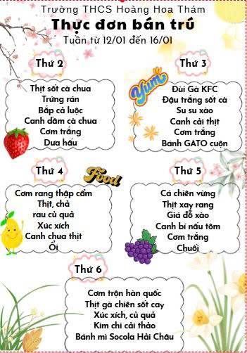 🌷Nhà trường xin gửi tới các bậc phụ huynh và các con học sinh Thực đơn tuần từ 12/01-16/01/2026