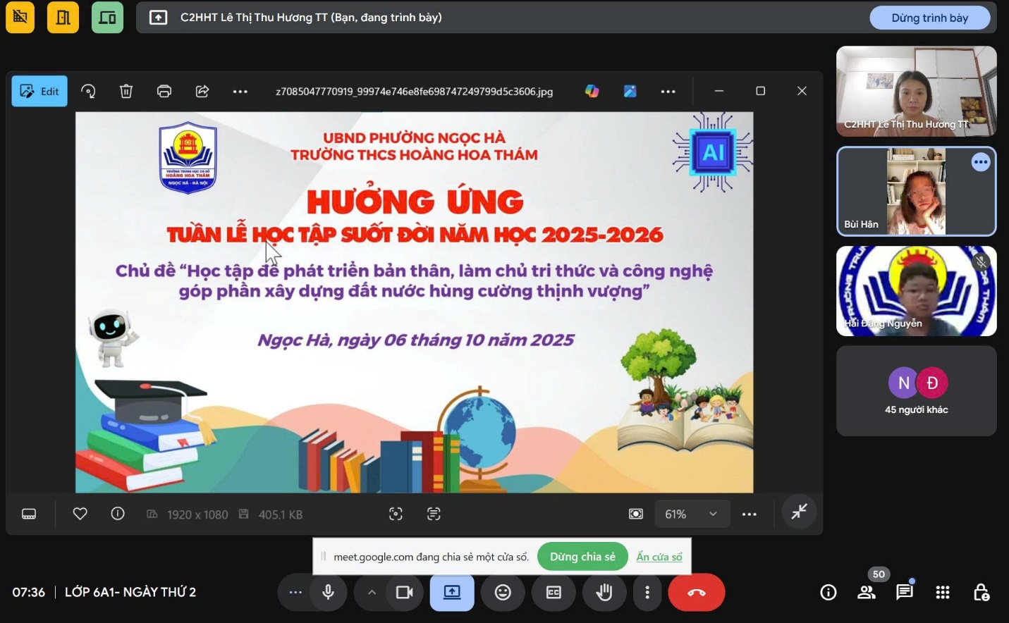 Cô Nguyễn Ngọc Dung – Hiệu trưởng nhà trường – chia sẻ: “Dù bão khiến học sinh không thể đến trường, nhưng tinh thần học tập và lòng yêu nước vẫn luôn được giữ vững. Tiết chào cờ trực tuyến hôm nay là minh chứng cho bản lĩnh, ý chí và sự thích ứng linh hoạt của thầy trò trường THCS Hoàng Hoa Thám.”