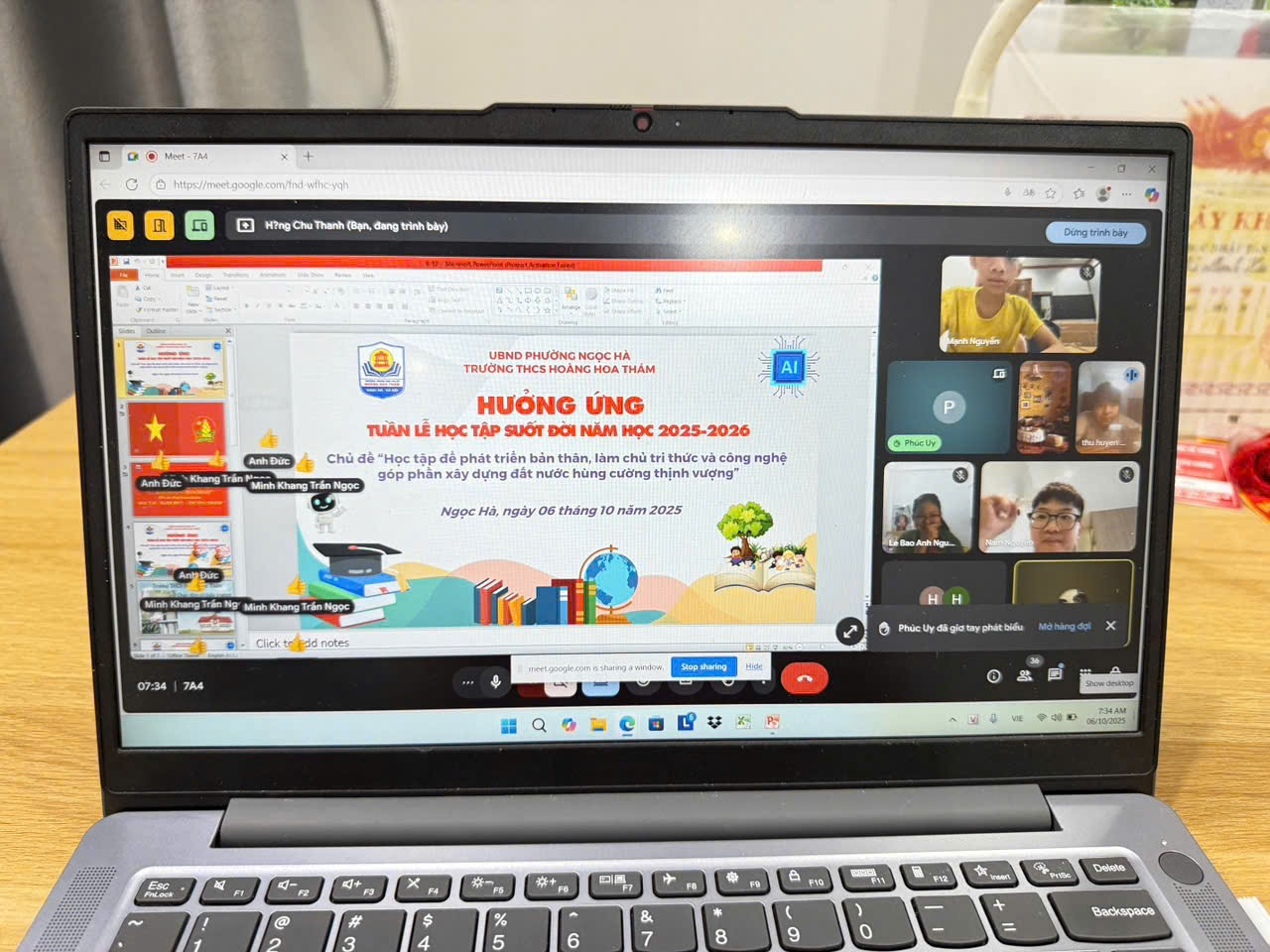 Cô giáo Nguyễn Thị Thu Hiền – Tổ trưởng tổ Xã hội chia sẻ: “Dù bão đến bất ngờ, nhưng với tinh thần chủ động và tinh thần ‘ngừng đến trường – không ngừng học’, thầy trò chúng tôi vẫn đồng hành cùng nhau trên lớp học trực tuyến. Đây cũng là cơ hội để cả giáo viên và học sinh rèn luyện kỹ năng sử dụng công nghệ trong dạy – học hiện đại.”