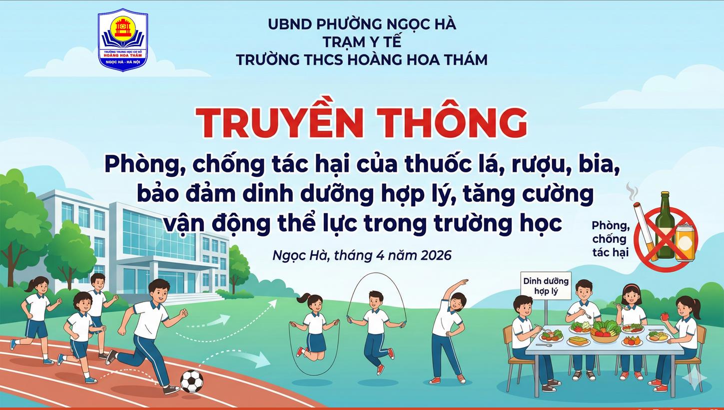 Sáng ngày 14/4/2026, Trường THCS Hoàng Hoa Thám phối hợp với Trạm y tế phường Ngọc Hà đã tổ chức thành công chương trình truyền thông chuyên đề về phòng chống tác hại của rượu, bia, thuốc lá, kết hợp với tư vấn dinh dưỡng và vận động thể lực dành cho học sinh từ 13 đến 17 tuổi. Đây là hoạt động thiết thực, góp phần nâng cao nhận thức và xây dựng lối sống khoa học, lành mạnh cho học sinh trong bối cảnh xã hội hiện đại.