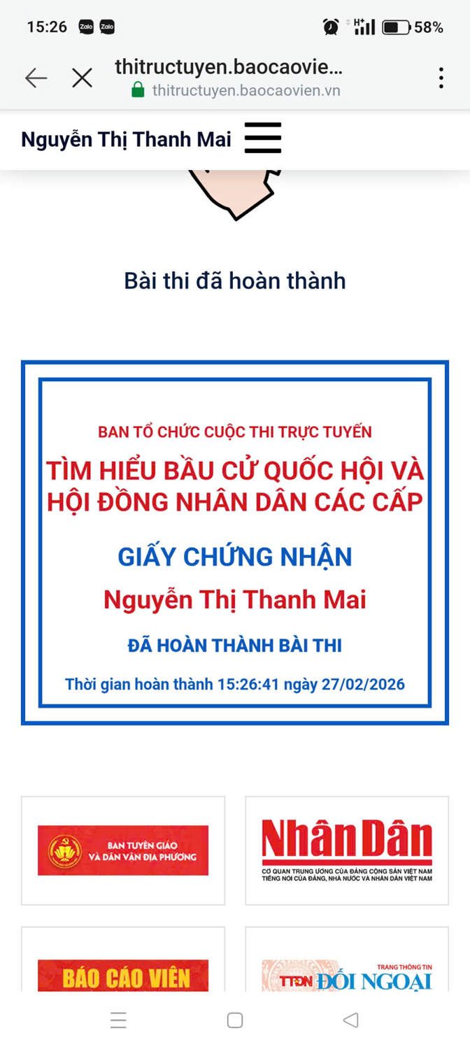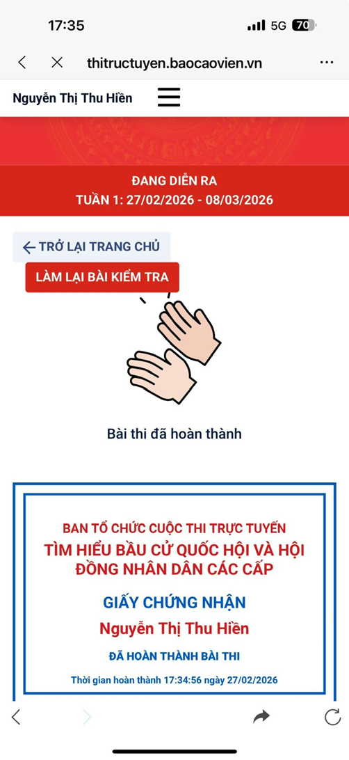 Cuộc thi diễn ra trong 2 tuần, với Tuần thi thứ 1 bắt đầu từ ngày 27/02/2026 đến ngày 08/03/2026. Đây là đợt sinh hoạt chính trị sâu rộng, giúp mỗi CBGV-NV nắm vững hơn các quy định của pháp luật, hiểu rõ về quyền và nghĩa vụ trong ngày hội bầu cử - Ngày hội của toàn dân. Với tính lan tỏa, từ Ban Giám hiệu đến các thầy cô giáo trẻ, từ nhân viên hành chính đến nhân viên phục vụ, tất cả đều đồng lòng tham gia với mục tiêu: 100% CBGV-NV hoàn thành bài thi với kết quả cao nhất. Nhiều thầy cô không chỉ hoàn thành bài thi của mình mà còn nhiệt tình hướng dẫn, hỗ trợ đồng nghiệp thao tác trên các thiết bị công nghệ để truy cập vào đường link dự thi một cách nhanh chóng.