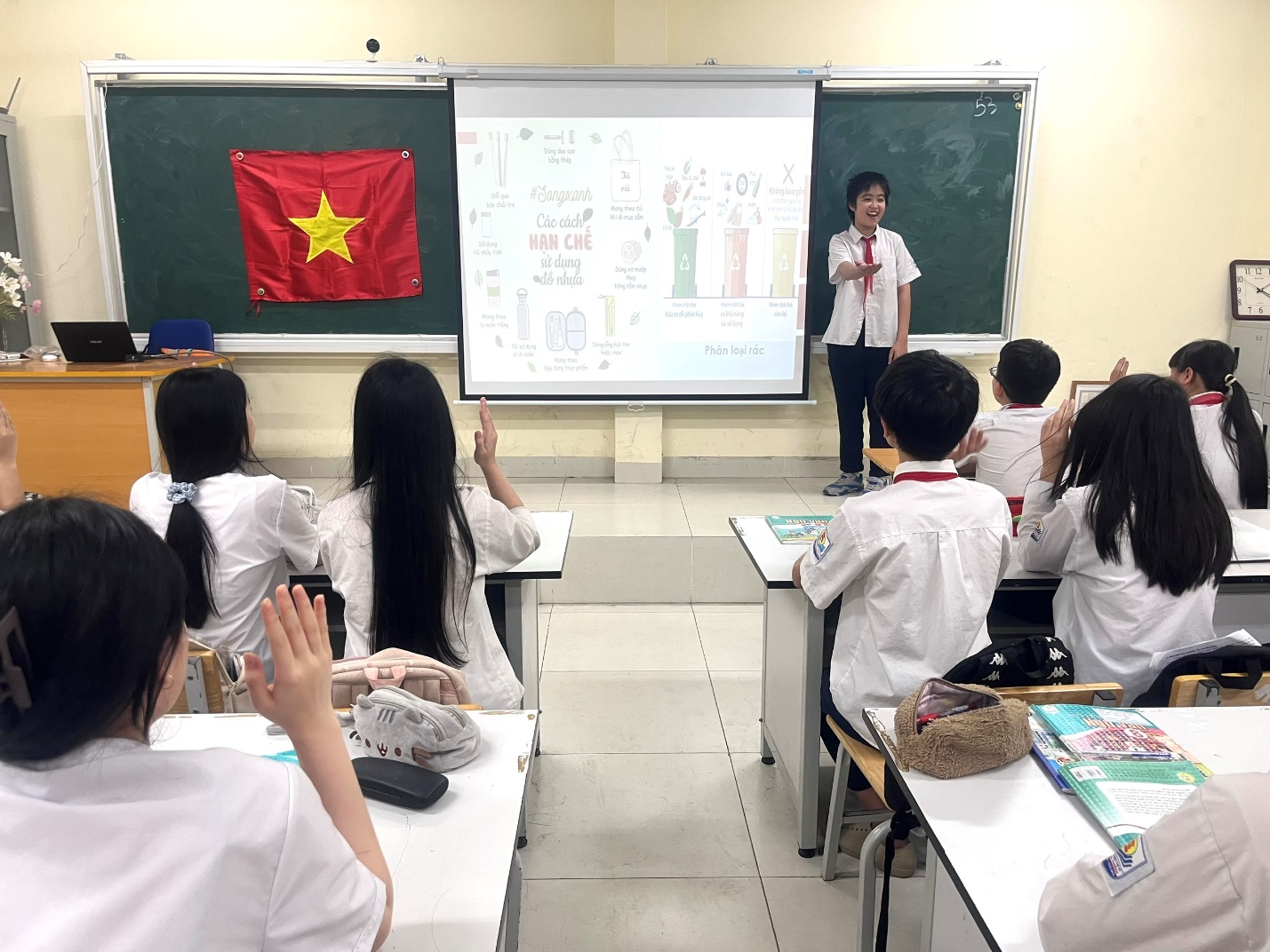 Trước hết là thay đổi thói quen cá nhân: học sinh được khuyến khích sử dụng bình nước cá nhân, hạn chế túi nilon, nói không với đồ nhựa dùng một lần. Những hành động nhỏ như mang theo hộp đựng đồ ăn, tái sử dụng đồ dùng đã được các bạn hưởng ứng tích cực.