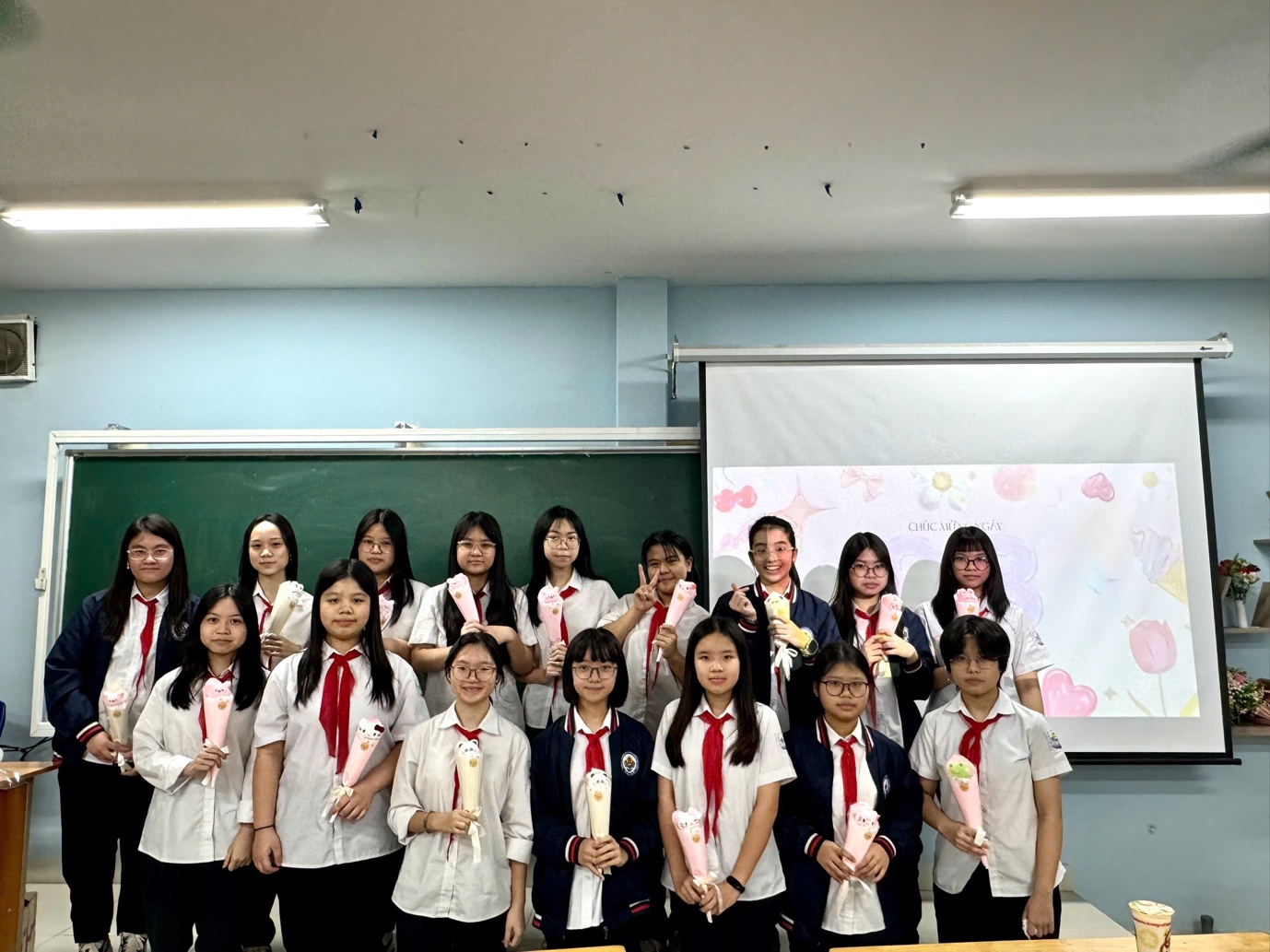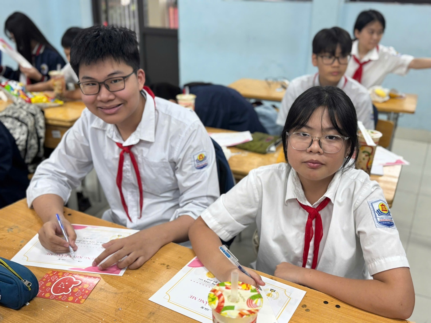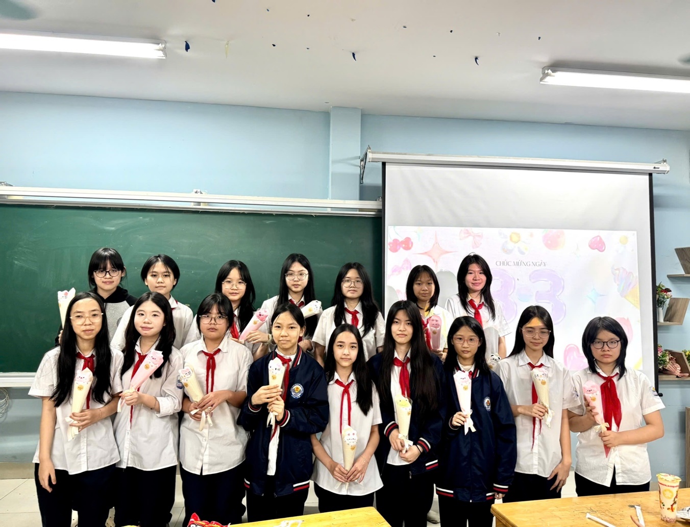 Không khí lớp học càng trở nên vui vẻ khi các bạn nam chuẩn bị những món quà nhỏ để tặng các bạn nữ trong lớp. Những món quà tuy đơn giản nhưng chứa đựng sự quan tâm và tình bạn đáng quý.