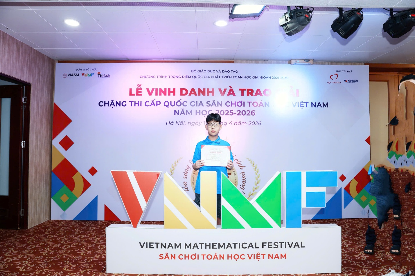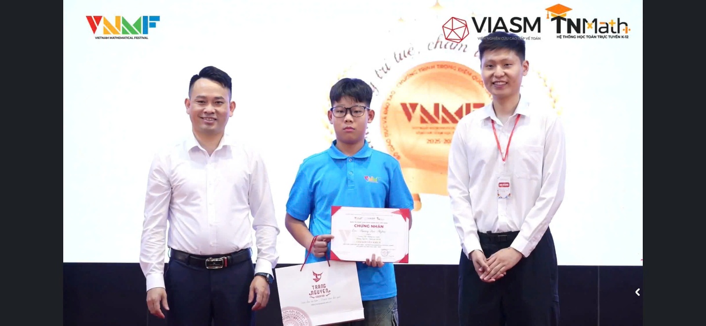 Ngày hôm nay 19/4/2026 em Nghĩa đa vinh dự cùng với 200 học sinh đến từ khắp các tỉnh trong cả nước về dự lễ vinh danh và trao giải chặng thi cấp Quốc gia sân chơi toán học VNMF Việt Nam. Tại chặng Quốc gia – nơi quy tụ những thí sinh xuất sắc nhất, Hoàng Đại Nghĩa đã tiếp tục tỏa sáng với phong độ ổn định và tinh thần thi đấu nghiêm túc. Thành tích mà em đạt được là minh chứng rõ nét cho sự kiên trì, chăm chỉ và niềm đam mê học tập không ngừng nghỉ.