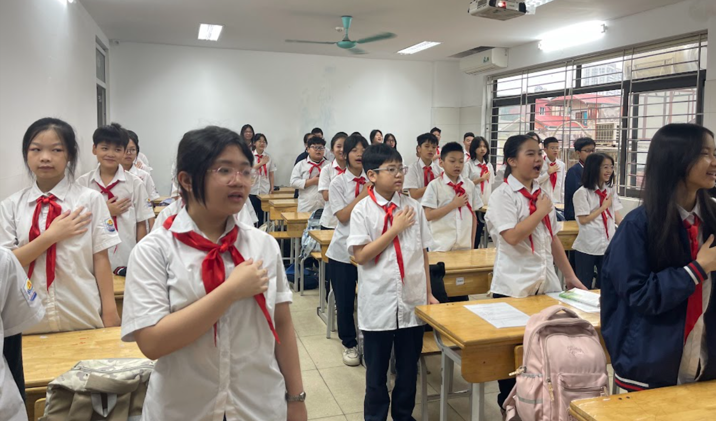 Tập thể lớp 6A1 thực hiện nghi thức chào cờ đầu tuần đầy trang nghiêm