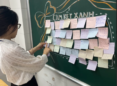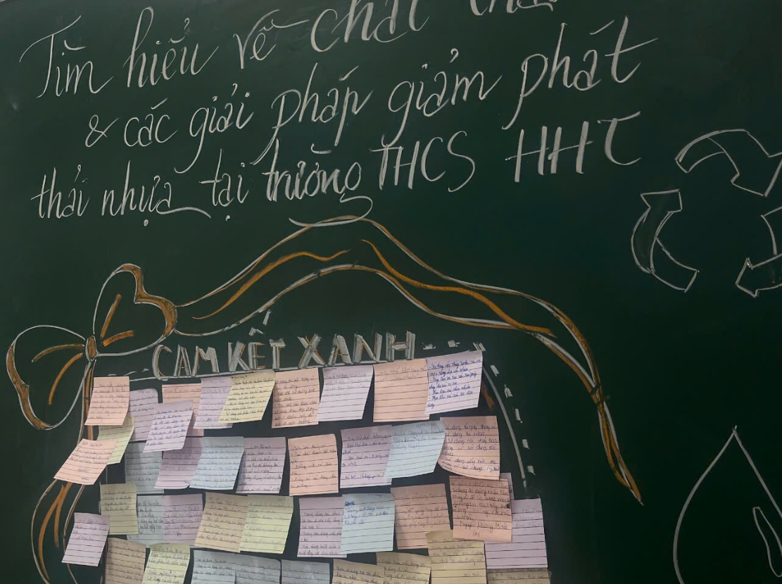 Khép lại buổi hoạt động là một khoảnh khắc đầy ý nghĩa mang tên “Cam kết xanh”. Từng bạn học sinh nhận những tờ giấy note nhỏ xinh, lặng lẽ ghi lên đó những việc làm cụ thể mà bản thân sẽ thực hiện để góp phần giảm thiểu rác thải nhựa. Những mảnh giấy nhiều sắc màu dần phủ kín góc cam kết, tạo nên một “bức tranh xanh” rực rỡ – nơi lưu giữ những lời hứa giản dị nhưng chân thành. Đó không chỉ là những dòng chữ, mà còn là trách nhiệm, là ý thức và là sự khởi đầu cho những thay đổi tích cực.