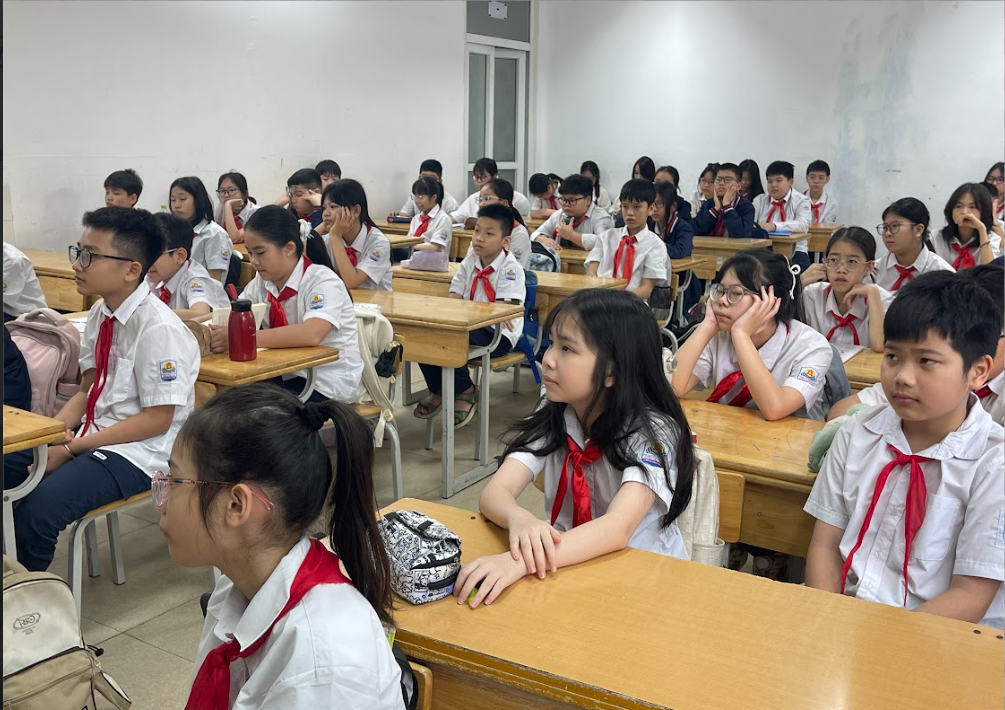 Các bạn học sinh lớp 6A1 chăm chú lắng nghe buổi tuyên truyền về giảm phát thải nhựa