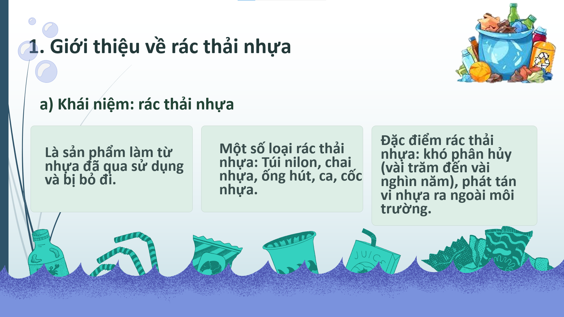 Trong tiết học, chúng em được tìm hiểu về rác thải nhựa – những sản phẩm quen thuộc như túi nilon, chai nhựa, ống hút… sau khi sử dụng bị thải ra môi trường. Điều khiến chúng em bất ngờ là loại rác này rất khó phân hủy, có thể tồn tại hàng trăm đến hàng nghìn năm và gây ảnh hưởng lớn đến môi trường cũng như sức khỏe con người.