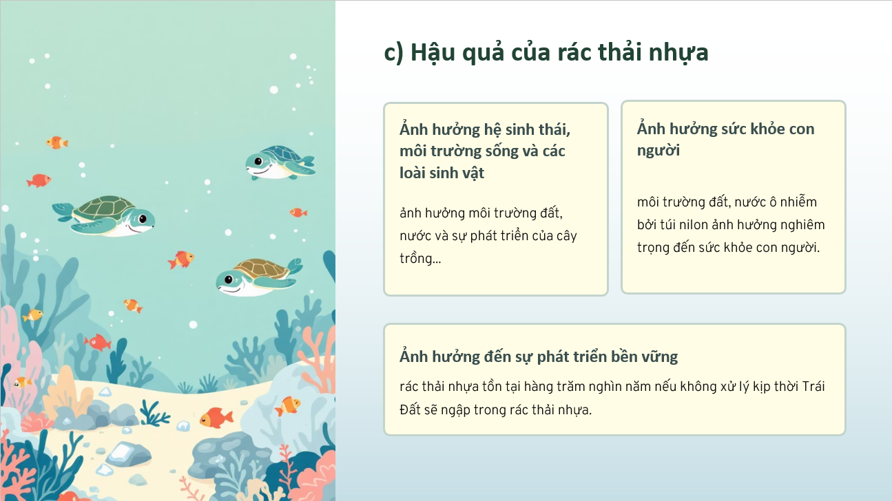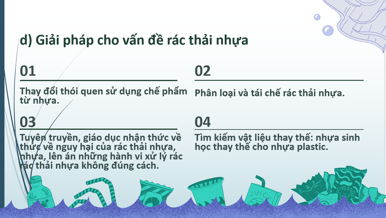 Qua bài trình chiếu và phần thuyết trình của các bạn, chúng em hiểu rõ hơn về thực trạng đáng lo ngại của rác thải nhựa hiện nay. Mỗi phút trên thế giới có tới hàng triệu chai nhựa được sử dụng, và ở Việt Nam, lượng túi nilon tiêu thụ cũng rất lớn. Điều này khiến môi trường ngày càng bị ô nhiễm nghiêm trọng nếu không có biện pháp xử lý kịp thời .