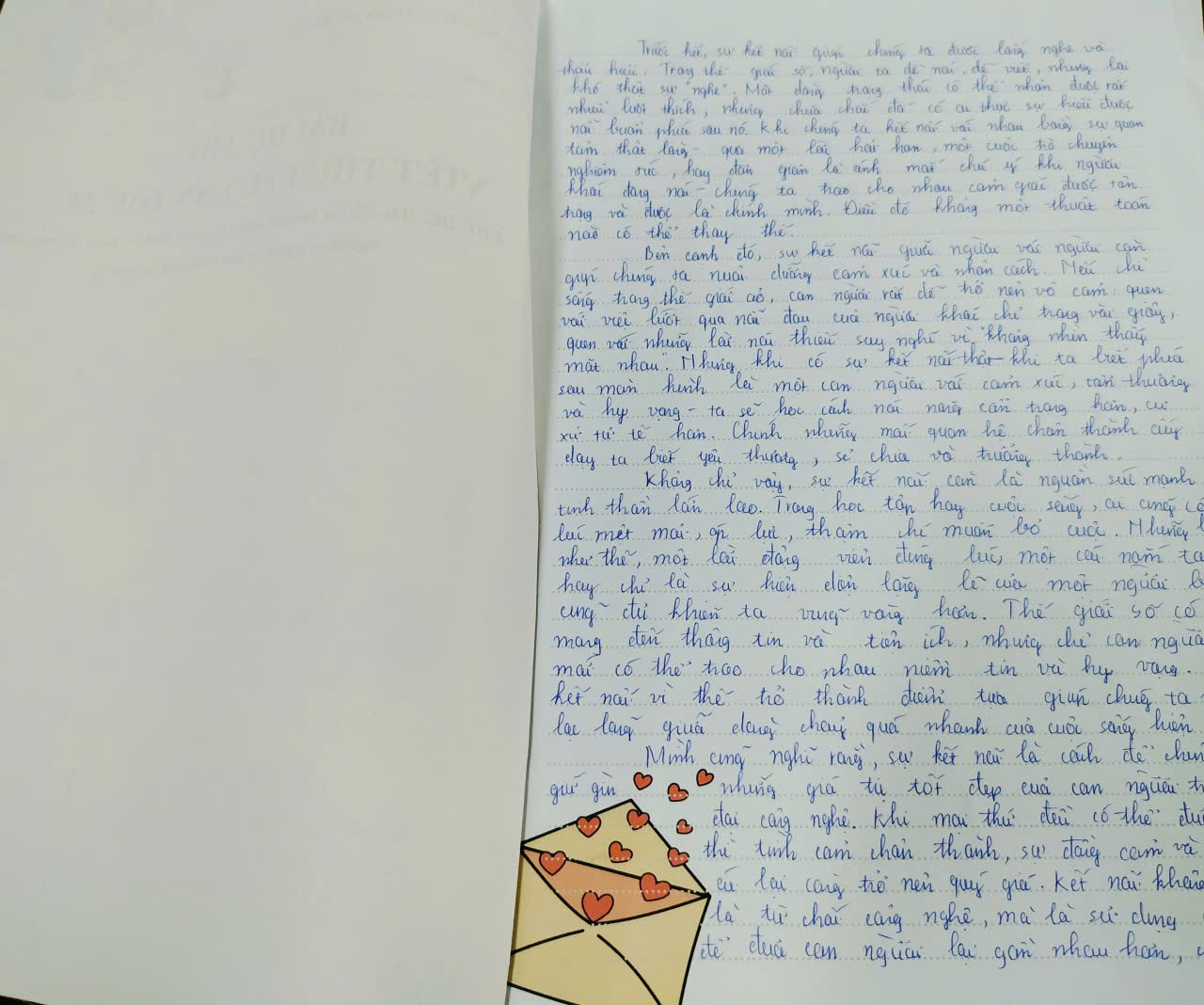 Qua từng trang giấy, hình ảnh một thế giới số hiện lên vừa hiện đại, tiện lợi, vừa ẩn chứa những nỗi cô đơn thầm lặng. Có bạn viết cho người bạn thân ở xa, kể về những lần trò chuyện qua màn hình nhưng vẫn mong một cái nắm tay ngoài đời thực. Có bạn lại viết cho một người bạn tưởng tượng, để nhắn nhủ rằng dù công nghệ có phát triển đến đâu, con người vẫn luôn cần sự đồng cảm, lắng nghe và yêu thương thật lòng. Mỗi bức thư là một góc nhìn riêng, nhưng tất cả đều gặp nhau ở một điểm chung: khẳng định vai trò không thể thay thế của sự kết nối chân thành giữa người với người.