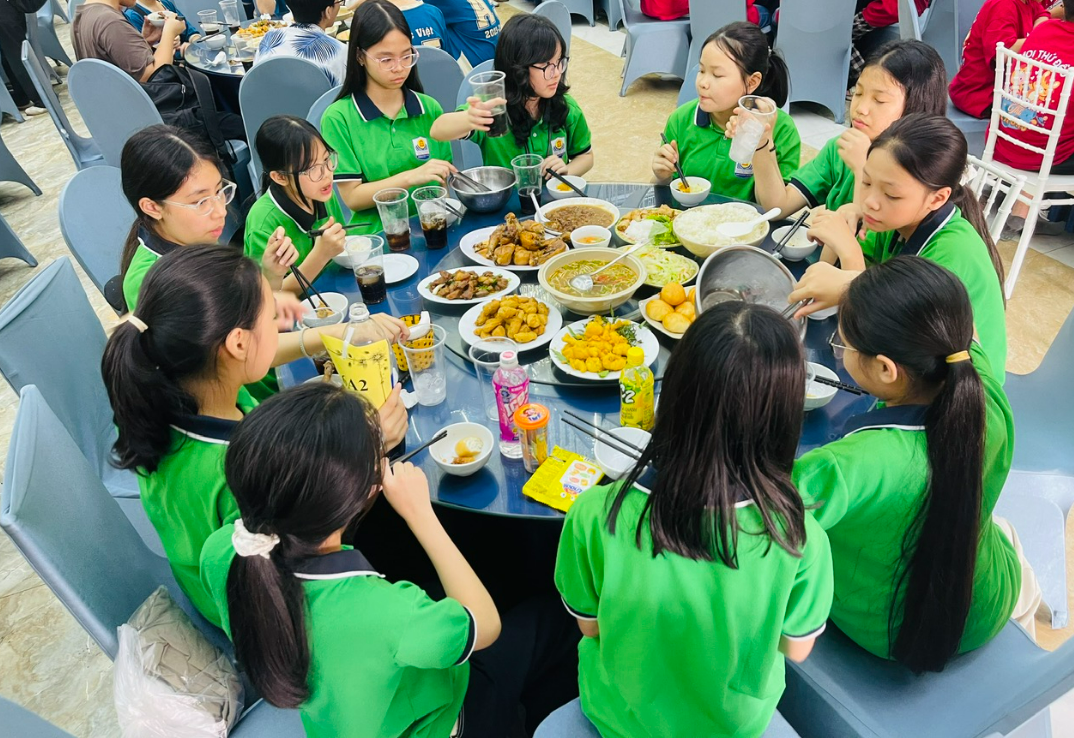 Sau đó, cả lớp di chuyển đến Nhà hàng Rồng Vàng để ăn trưa. Không khí thật vui vẻ, chúng em vừa thưởng thức những món ăn ngon vừa trò chuyện rôm rả, tiếng cười vang khắp bàn ăn.