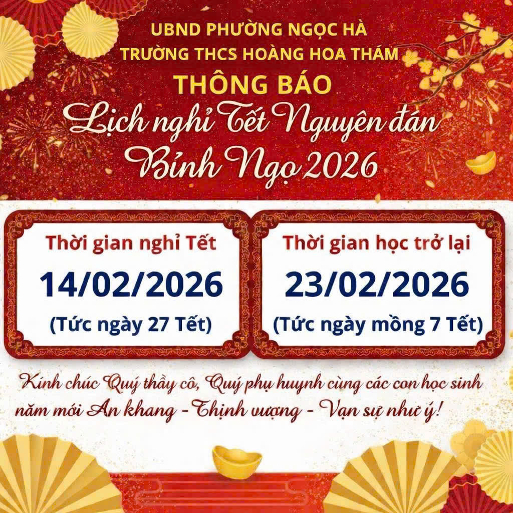 Trường THCS Hoàng Hoa Thám trân trọng thông báo lịch nghỉ Tết Nguyên Đán Bính Ngọ 2026: