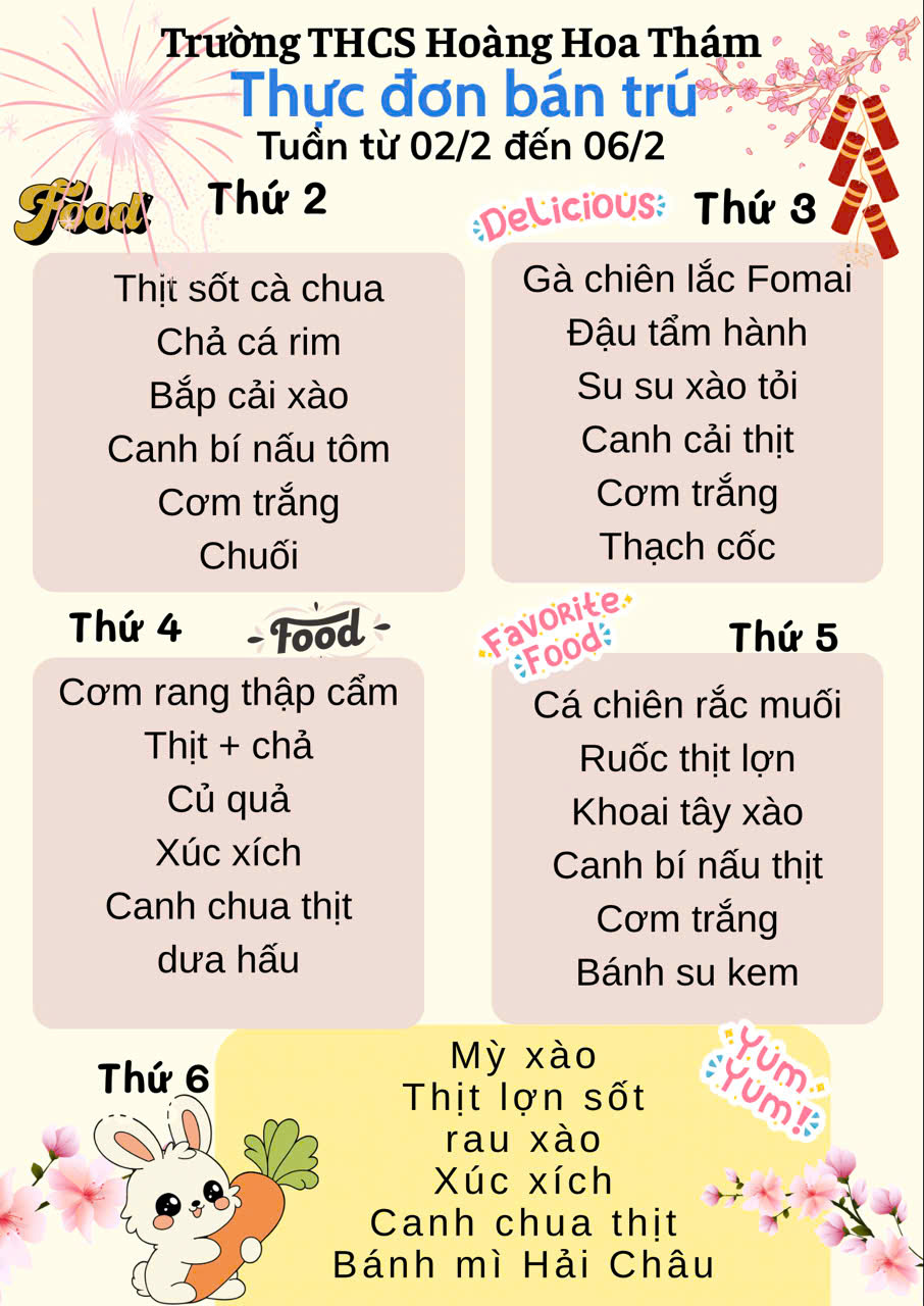 Thực đơn bán trú tuần từ 02/02-06/02/2026