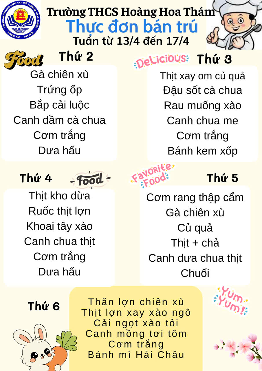 🌷Nhà trường xin gửi tới các bậc phụ huynh và các con học sinh Thực đơn tuần từ 13/04-17/04/2026