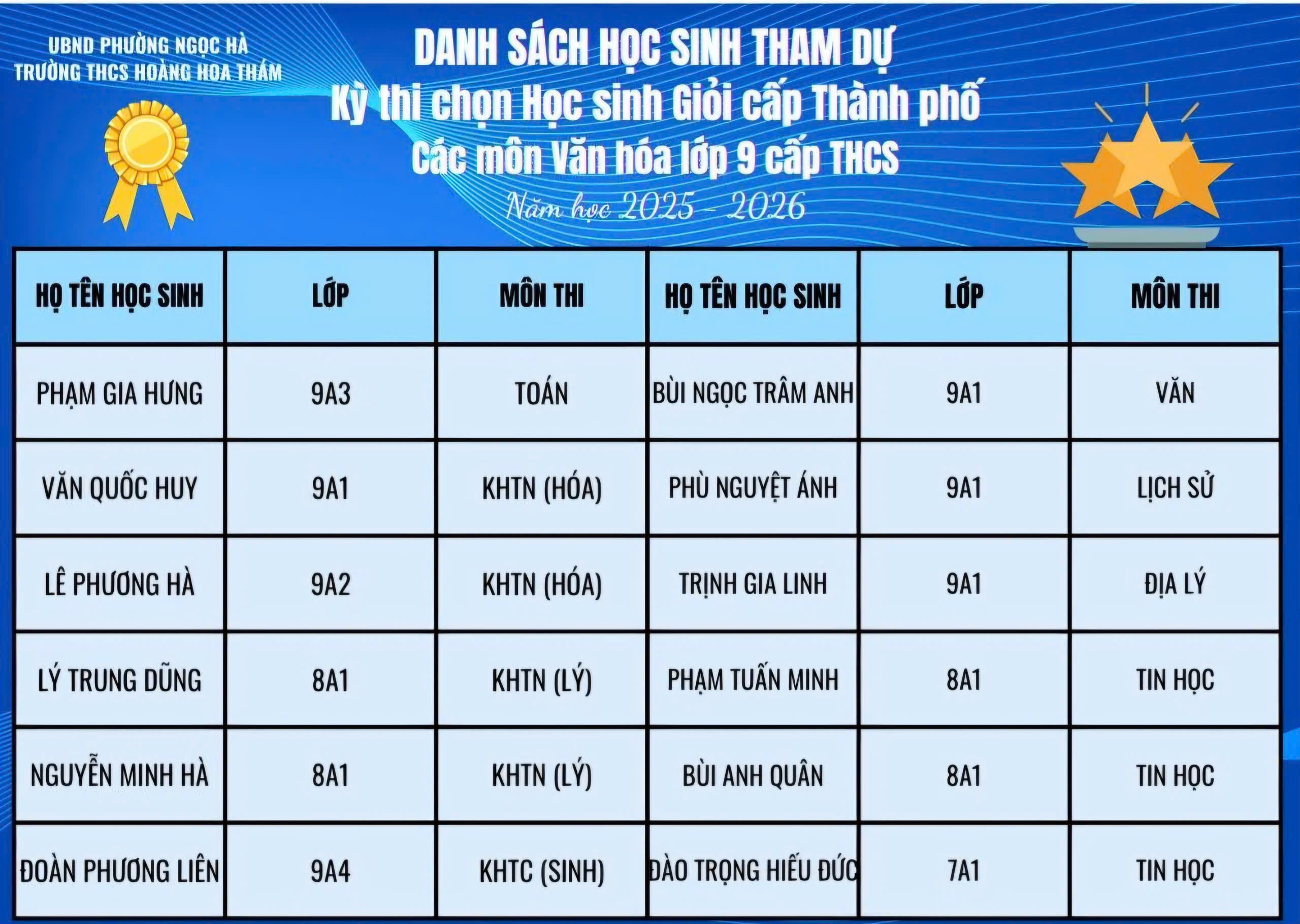 Kỳ thi học sinh giỏi các môn văn hóa Phường Ngọc Hà năm học 2025-2026 là một hoạt động chuyên môn có ý nghĩa rất lớn với các nhà trường trên địa bàn phường. Từ cuộc thi, phường sẽ phát hiện được những em học sinh có năng lực để tiếp tục bồi dưỡng chuyên sâu hướng đến kì thi học sinh giỏi cấp Thành phố. Cuộc thi cũng đã phần nào đánh giá được chất lượng dạy và học của các nhà trường nhất là công tác giáo dục mũi nhọn. Tham dự kì thi này, học sinh trường THCS Hoàng Hoa Thám đã thực sự ghi được dấu ấn đậm nét khi gặt hái được nhiều thành tích cao, khẳng định vị thế của nhà trường trên địa bàn.