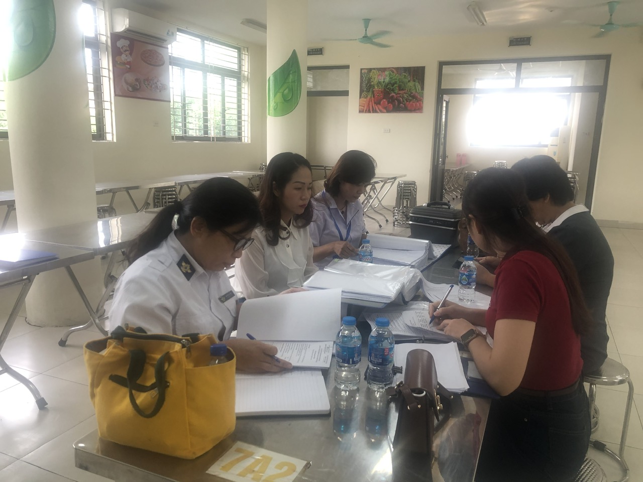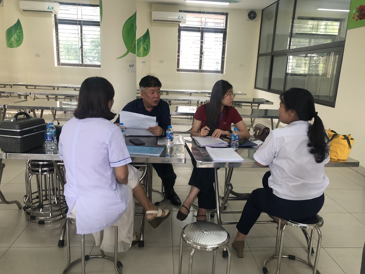 Đoàn kiểm tra rà soát hồ sơ và các điều kiện đảm bảo an toàn thực phẩm tại bếp ăn bán trú Trường THCS Hoàng Hoa Thám.